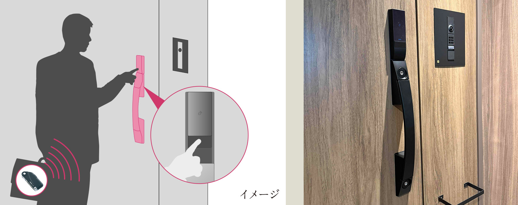 ハンズフリーシステム Raccess(ラクセス)ポケットやカバンにカギを入れた状態でリーダー部分のボタンを押して頂くと住戸の玄関ドアのロック解除が可能です。 *お引き渡し時にRaccessキーとノンタッチキーをお渡しいたします。ノンタッチキーの場合は、リーダにキーをかざして頂く必要がございます。