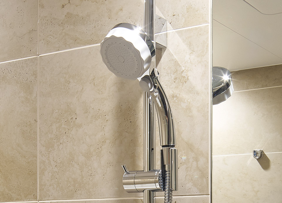 節水シャワーヘッドシャワーヘッドについたボタンで一時的に流水を止められる為、無駄な使用を減らすことができます。