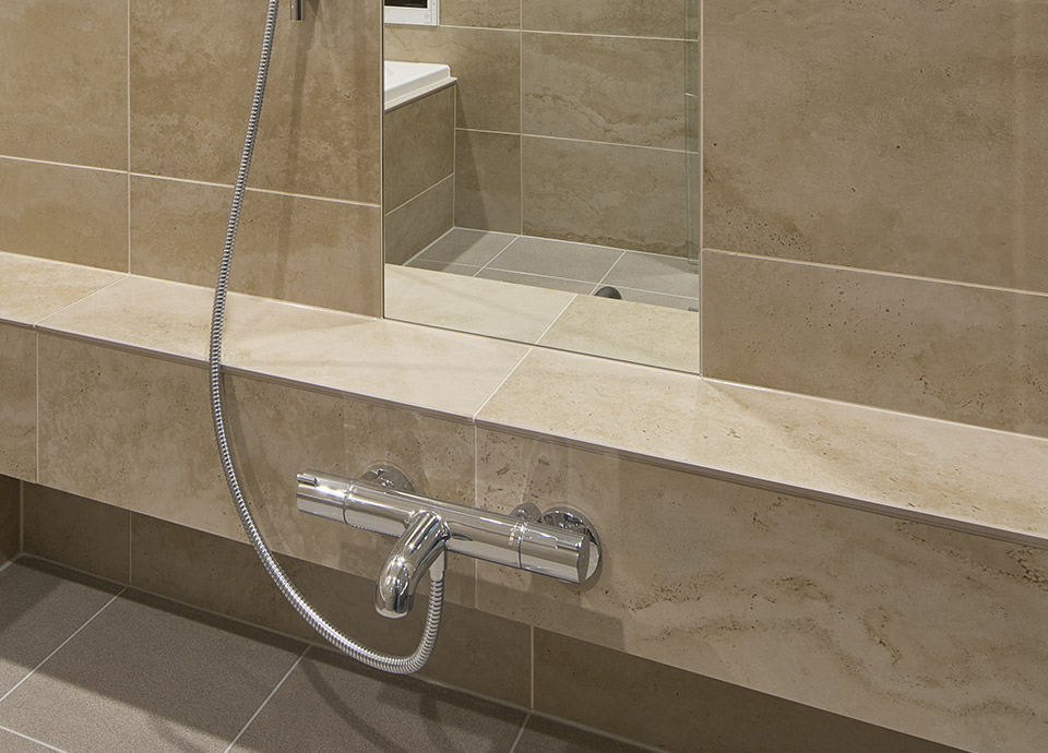 浴室カウンター小物をおけるカウンターは壁タイルと同じ素材で美しく仕上げました。