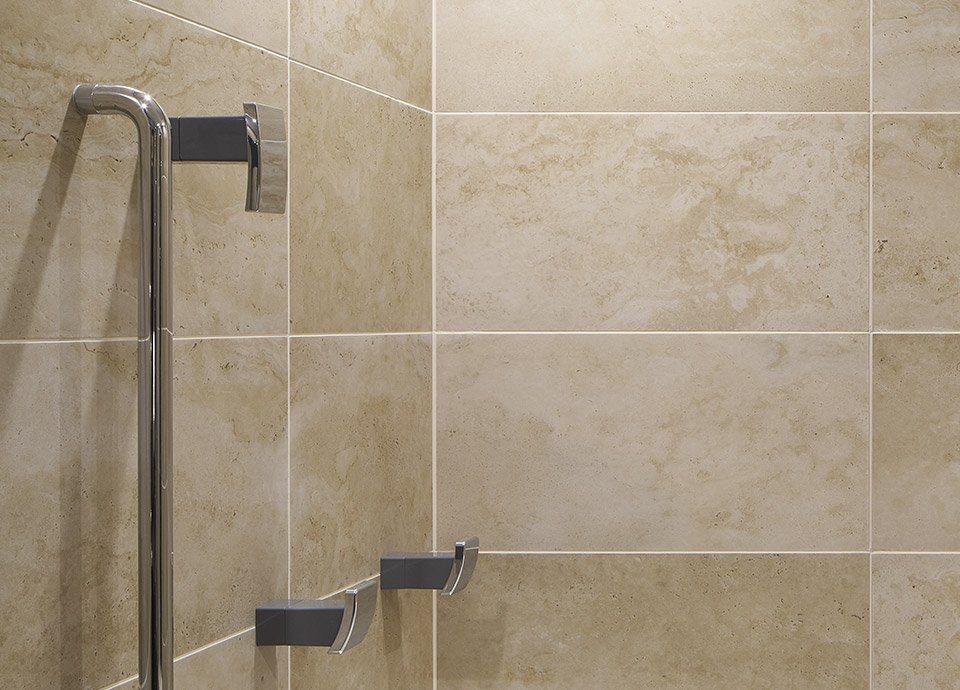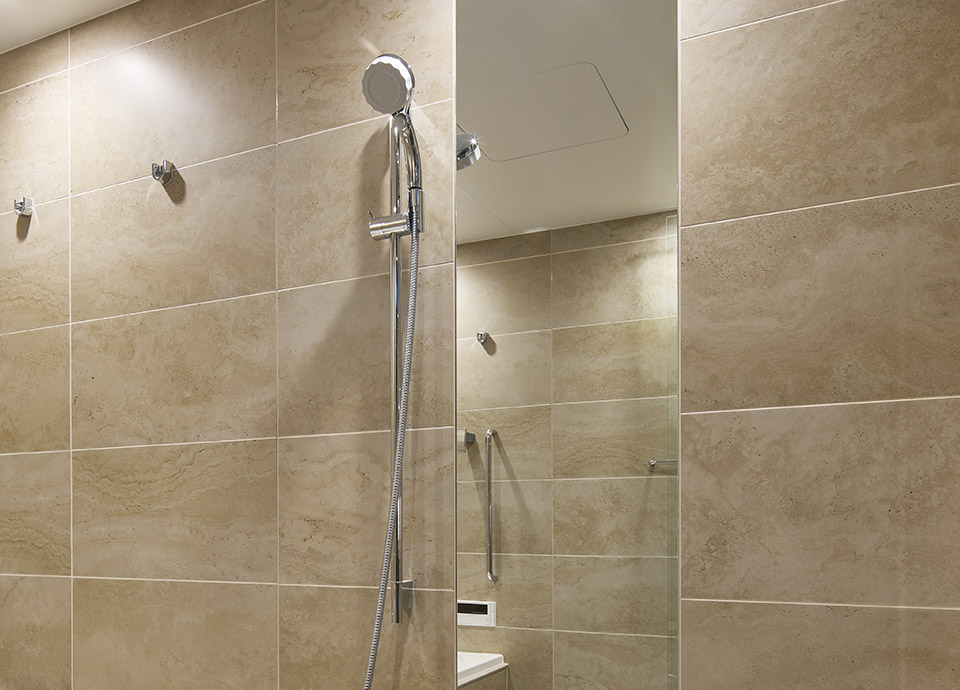 壁バスルームの壁面には上質感あるタイルを採用しました。