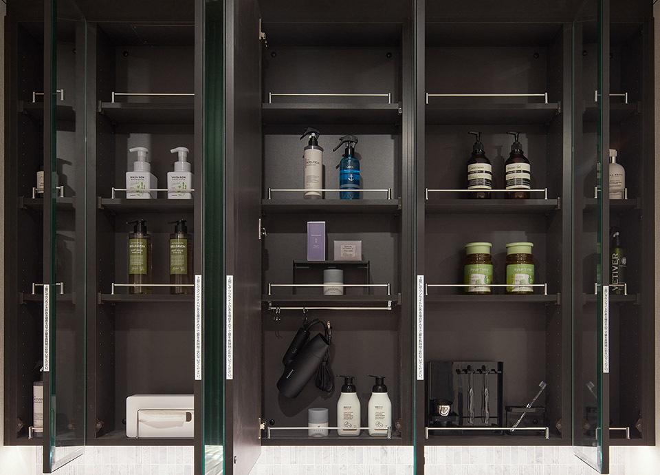 五面鏡裏収納五面鏡の裏には、洗面道具、コスメ、ヘアケア用品などが置ける収納を設けました。