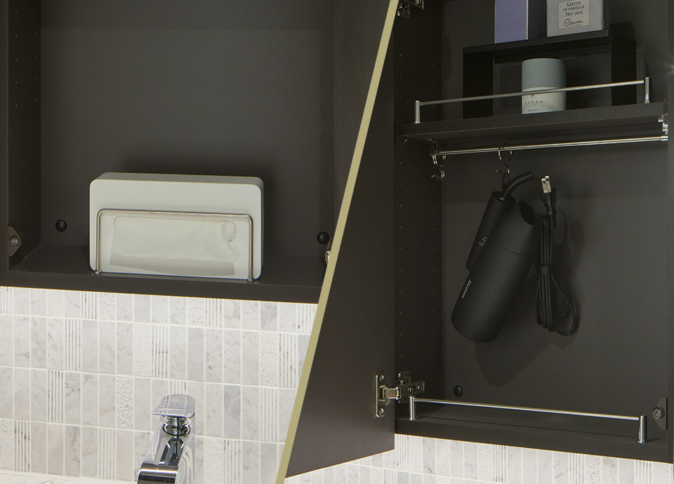 ドライヤーフック&ティッシュスペースドライヤーやティッシュボックスなどをきれいに収納することができる専用スペースを設けました。 *タイプによりティッシュスペース位置は異なります。