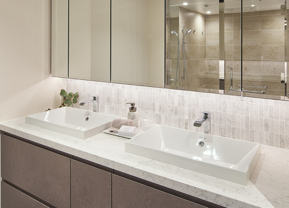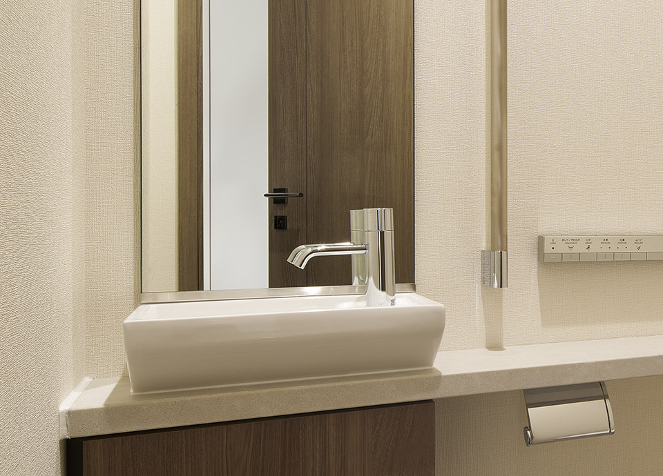 鏡壁面タイルと同面仕上げとなっており清掃性に優れています。