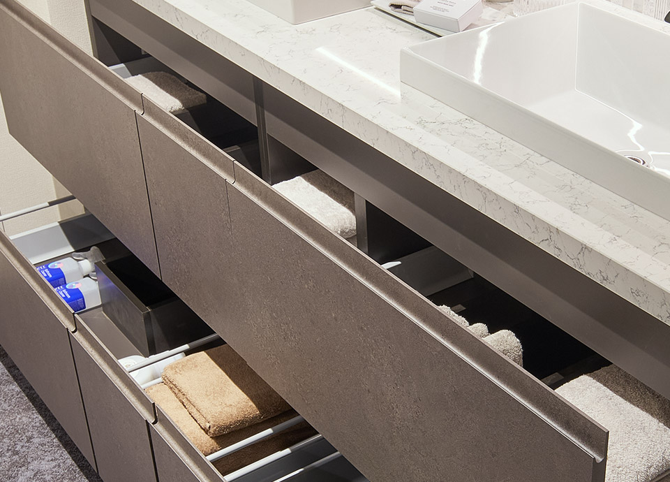 ボウル下収納洗面ボウル下には便利な引き出し収納を設置しました。 *タイプにより収納の形状は異なります。*床はタイルになります。