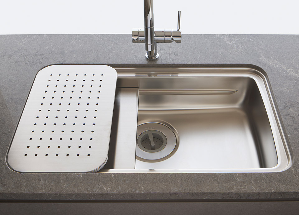 静音ワイドシンク水はね音などを軽減する大型シンク。プレートの設置で、調理スペースを拡大できます。
