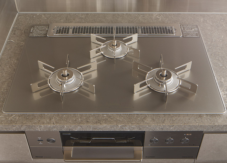 ガラストップコンロ DELICIA調理タイマーや揚げ物の温度調節、両面焼きグリルなど、多彩な機能を搭載。お手入れもしやすいデリシアの3口ガスビルトインコンロを採用しました。