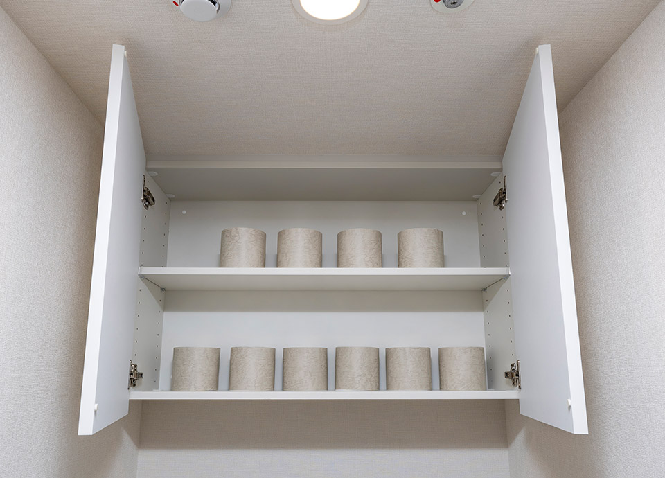 トイレ上部吊り収納トイレの上部/天井のスペースを有効活用し、掃除道具・トイレットペーパー等を収納する吊戸棚を設置しました。