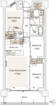※LDKの畳数にはキッチンの畳数を含みます。※キッチン部分の畳数には、冷蔵庫置場・カップボードが含まれています。