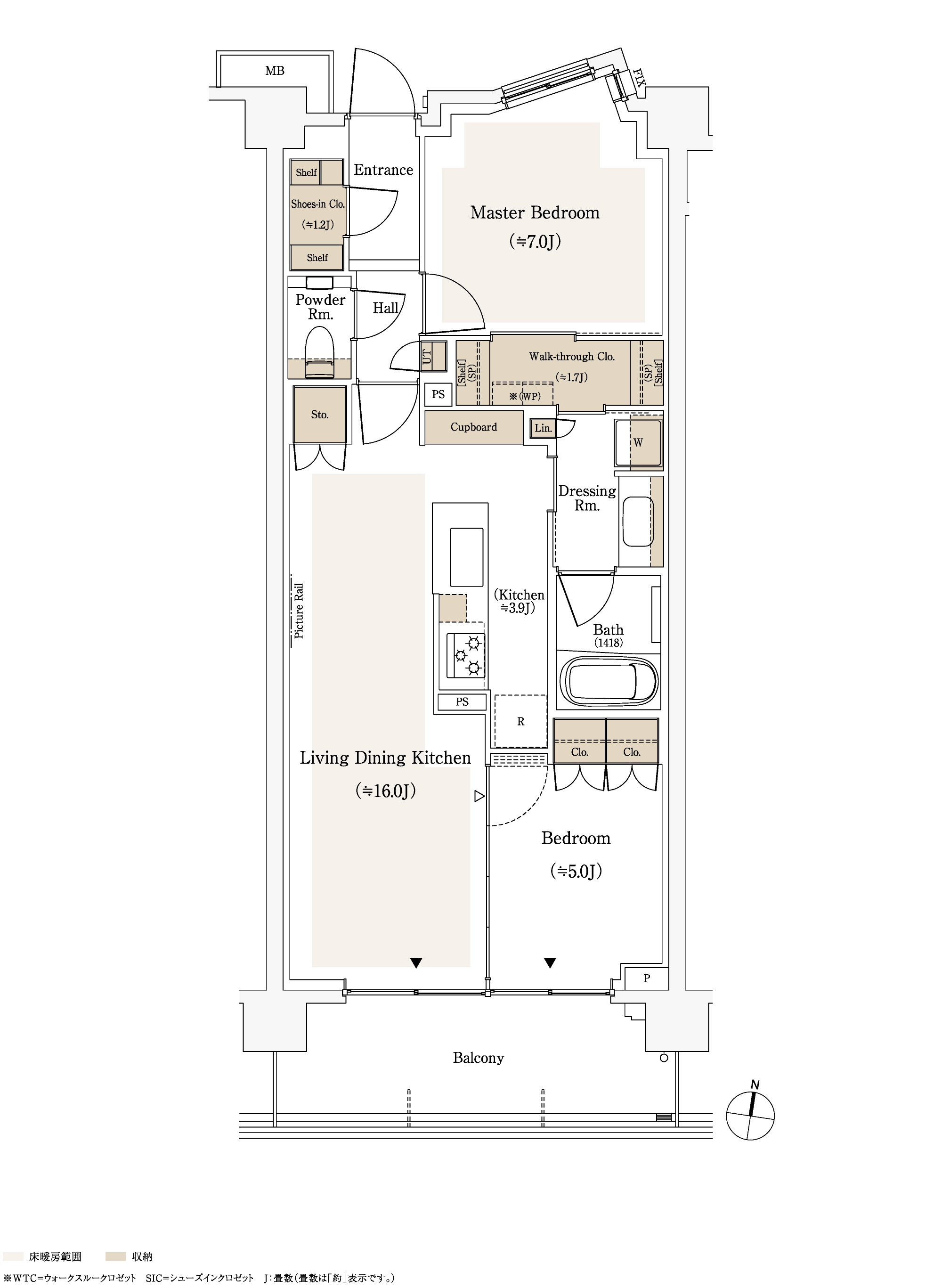 ※WIC=ウォークインクロゼット SIC=シューズインクロゼット SR=サービスルーム(納戸) WTC=ウォークスルークロゼット ML=マルチリネン庫 J:畳数(畳数は「約」表示です。)※掲載の間取り図面は設計段階のもので、変更になる場合があります。