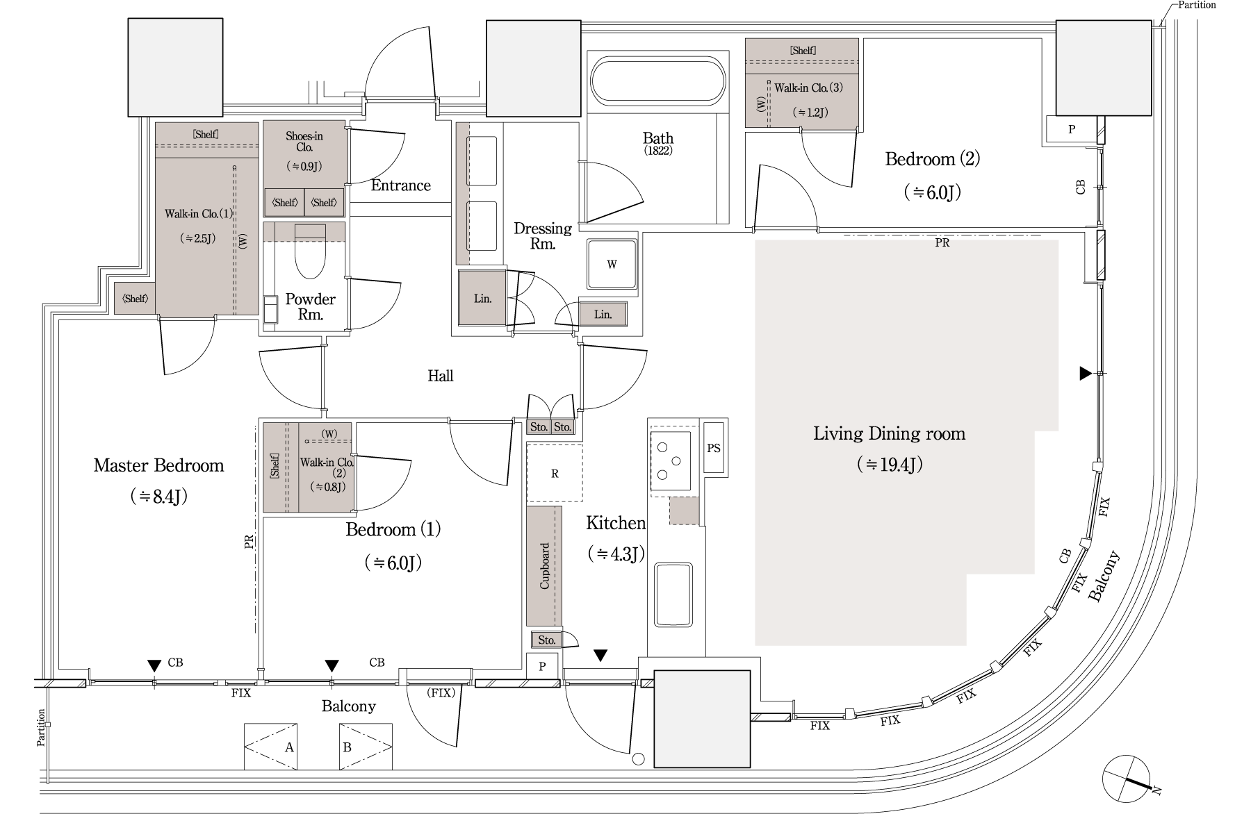 OUTLINE MAP ENTRY TOPトップページ CONCEPTコンセプト LOCATIONロケーション DESIGNデザイン ACCESSアクセス VIEW&PLAN眺望&プラン QUALITYクオリティ EQUIPMENTNEW!設備仕様 MAP現地案内図 OUTLINE物件概要 ENTRY物件エントリー PLAN premium102-PAnetype 専有面積:102.48㎡(約31.00坪)バルコニー面積:22.14㎡ 3LDK+3WIC+SIC <33・34F> 収納 床暖房 J=約畳数WIC: ウォークインクロゼット SIC:シューズインクロゼット※プレミアムプランとは33・34階の住戸で、天井高や一部の設備仕様をグレードアップしたプランです。 ※掲載の図面は設計段階の図面を基に描いたもので、実際とは異なります。また、施工上の理由および改良等により変更となる場合がございます。 ※住戸により仕様・形状が異なる場合がございます。