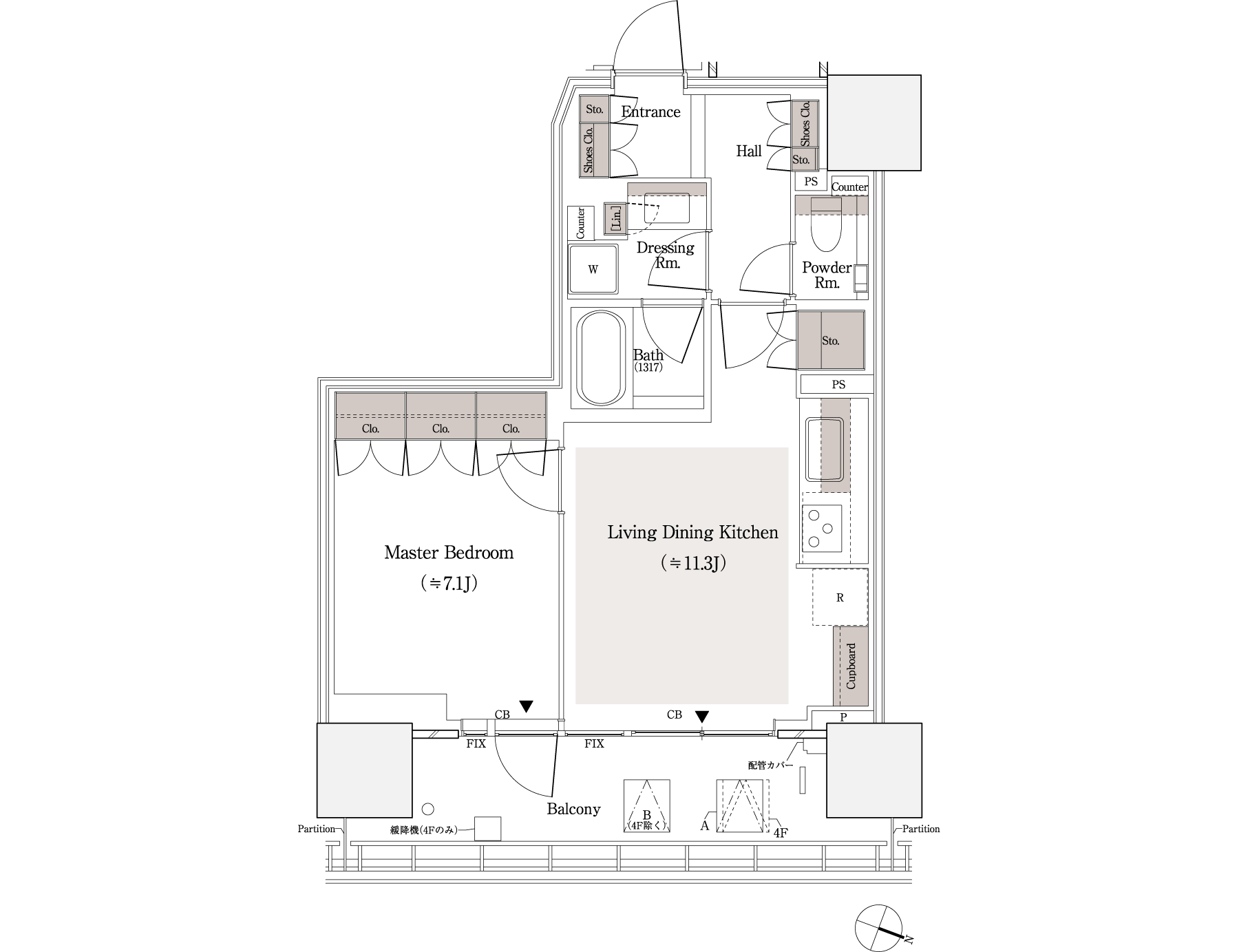 OUTLINE MAP ENTRY TOPトップページ CONCEPTコンセプト LOCATIONロケーション DESIGNデザイン ACCESSアクセス VIEW&PLAN眺望&プラン QUALITYクオリティ EQUIPMENTNEW!設備仕様 MAP現地案内図 OUTLINE物件概要 ENTRY物件エントリー PLAN 47-Ietype 専有面積:47.88㎡(約14.48坪)バルコニー面積:11.43㎡~12.61㎡ ※バルコニー面積は住戸の階数により異なります。 1LDK <4〜29F> 収納 床暖房 J=約畳数 ※掲載の図面は設計段階の図面を基に描いたもので、実際とは異なります。また、施工上の理由および改良等により変更となる場合がございます。 ※住戸により仕様・形状が異なる場合がございます。