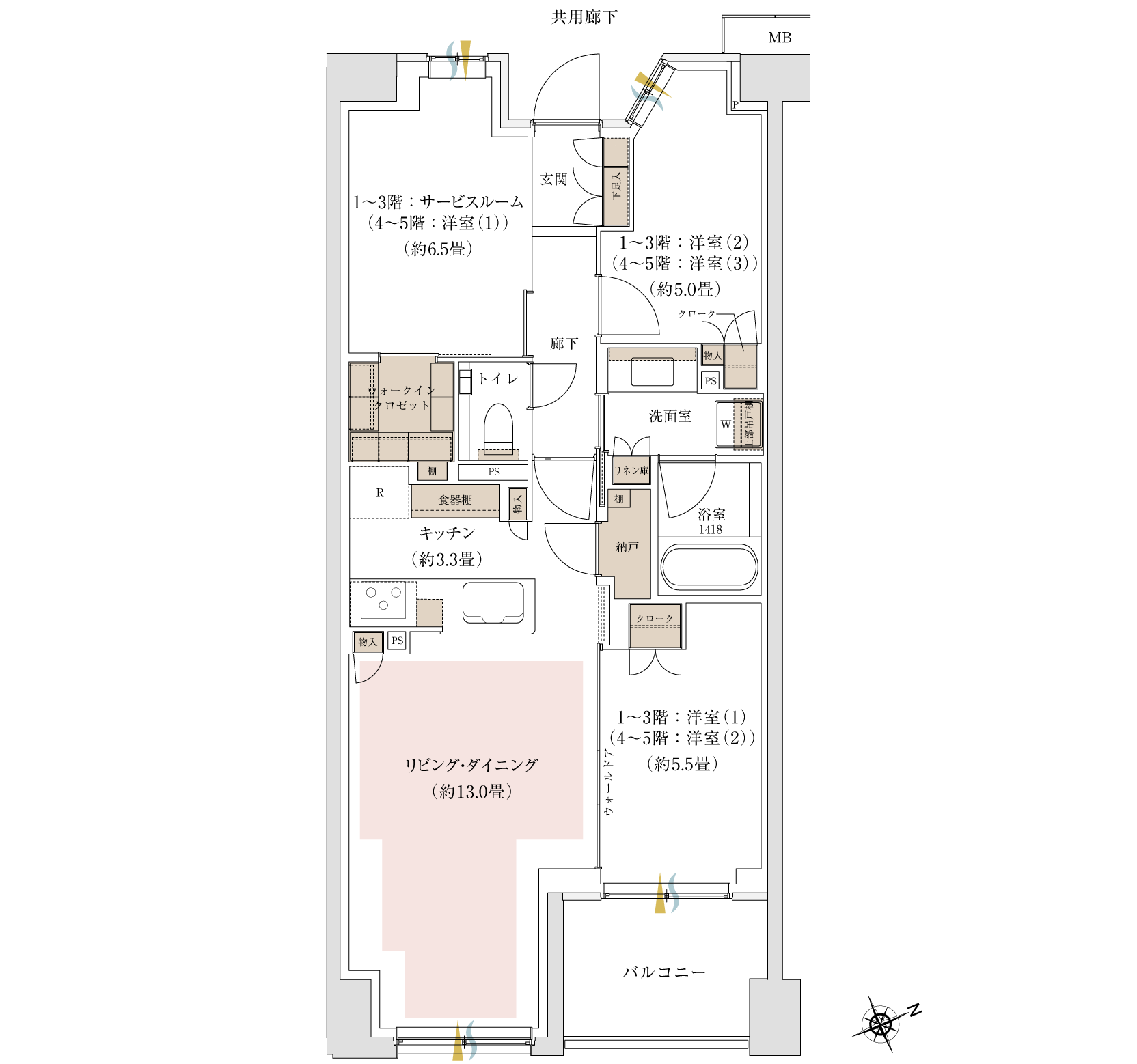 印刷用PDF プランページに戻る ※WIC:ウォークインクロゼット、SR:サービスルーム、N:納戸 ※掲載の図面は設計段階の図面を基に描いたもので実際とは異なります。また施工上の理由及び改良等により変更となる場合がございます。 ※住戸により仕様・形状が異なる場合がございます。 ※キッチン部分の畳数には、システムキッチン・冷蔵庫置場・カップボードが含まれています。