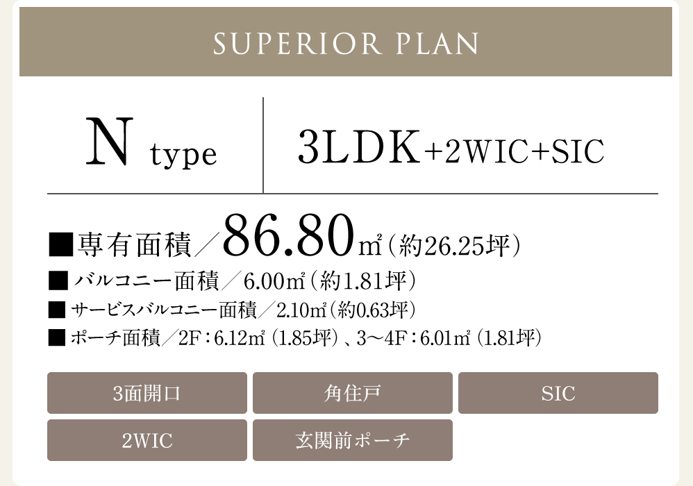 印刷用PDF プランページに戻る ※WIC:ウォークインクロゼット、SIC:シューズインクロゼット ※掲載の図面は設計段階の図面を基に描いたもので実際とは異なります。また施工上の理由及び改良等により変更となる場合がございます。 ※住戸により仕様・形状が異なる場合がございます。 ※キッチン部分の畳数には、システムキッチン・冷蔵庫置場・カップボードが含まれています。 ※スーペリアプランとは内装や設備機器等の一部をグレードアップした住戸となります。詳しくは係員にお問い合せください。