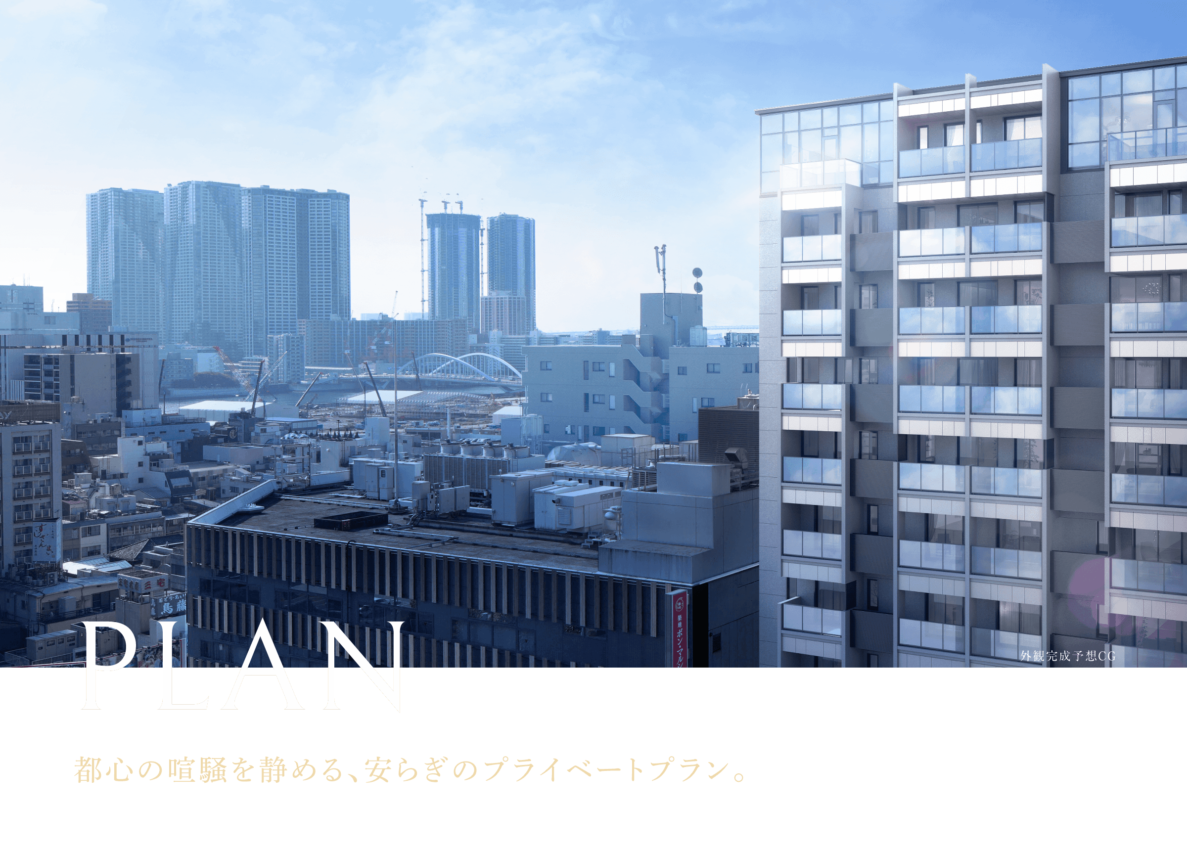PLAN 物件エントリー後、会員限定サイトにご登録いただきますと、 他プラン等を含む未公開情報をご覧いただけます。 ※WIC:ウォークインクロゼット SIC:シューズインクロゼット ※掲載の図面は設計段階の図面を基に描いたもので実際とは異なります。また施工上の理由及び改良等により変更となる場合がございます。 ※住戸により仕様・形状が異なる場合がございます。 ※代表タイプの間取りを表示しております。販売住戸の間取りについては本広告時の物件概要の[販売住戸の一覧]をご覧ください。 ※掲載の外観完成予想CGは、計画段階の図面を基に描き起こしたもので、形状・色等は実際とは異なります。なお、形状の細部、設備機器等は表現しておりません。また、現地向かいのセントラル東銀座(14階建)の屋上から南方向を撮影(2025年10月)した眺望写真を合成したもので、実際の住戸からの眺望とは異なります。眺望・景観は各階・各住戸により異なり、今後の周辺環境の変化に伴い将来にわたって保証されるものではありません。