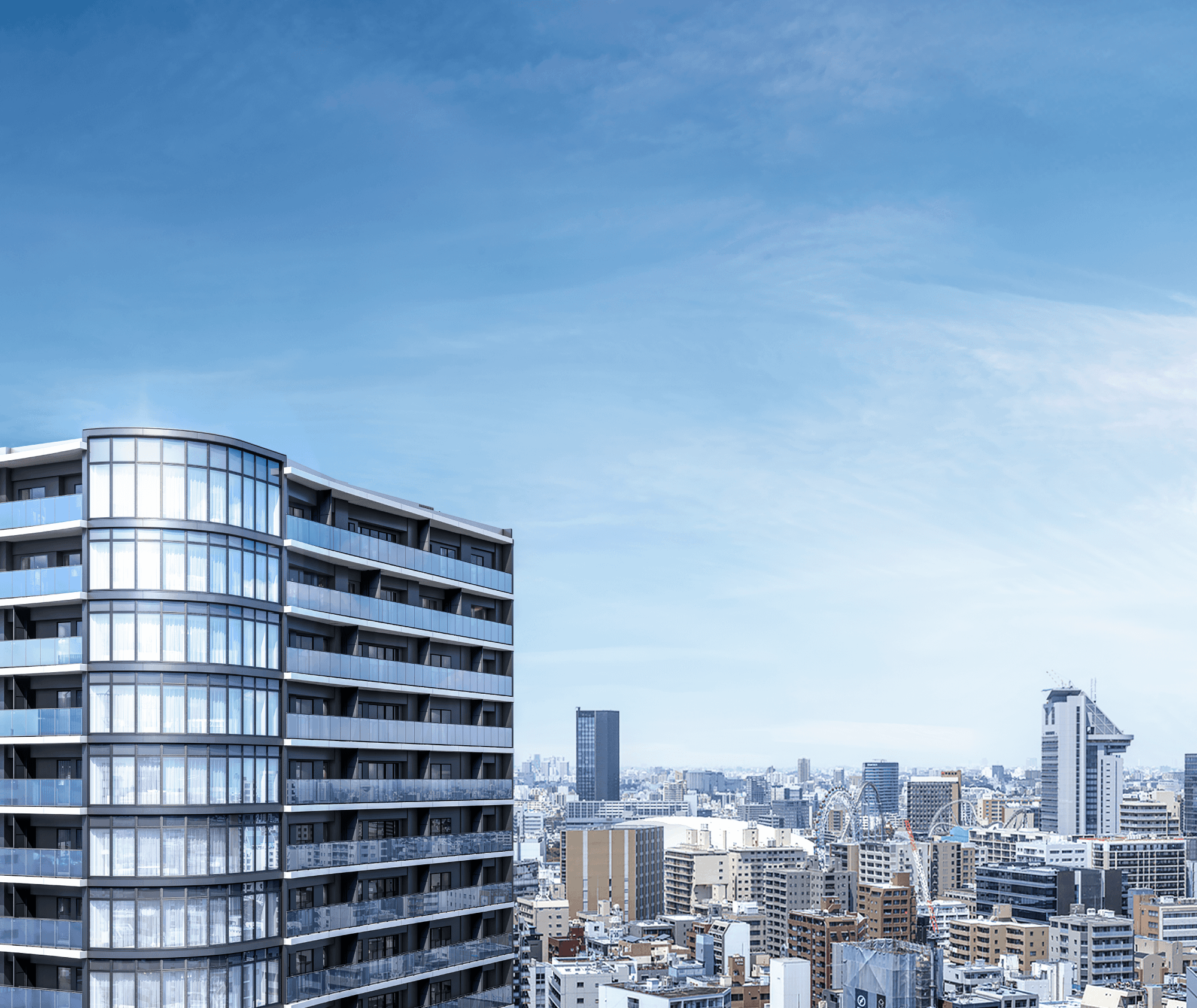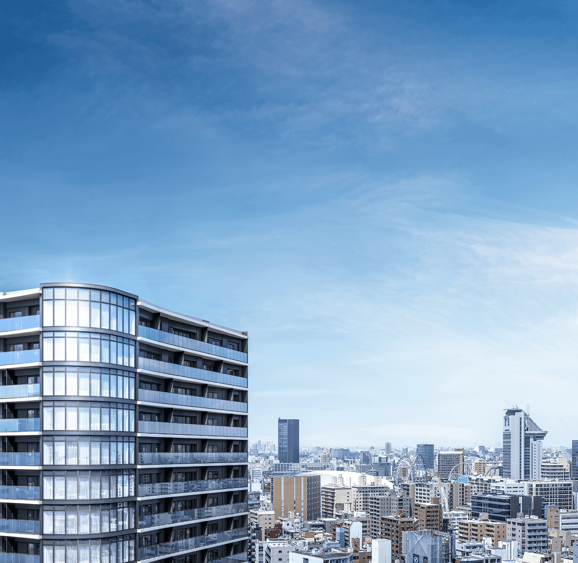 ※掲載の外観完成予想CG2は計画段階の図面を基に描き起こしたもので、形状・色等は実際とは異なります。現地(高さ約80m)から西方面を撮影(2025年7月)した眺望写真にCGを合成したものです。実際の住戸からの眺望とは異なります。眺望・景観は、各階・各住戸により異なり、今後の周辺環境の変化に伴い将来にわたって保証されるものではありません。なお、形状の細部、設備機器等は表現しておりません。また、建物内に描かれている家具・調度品は販売価格に含まれておりません。
