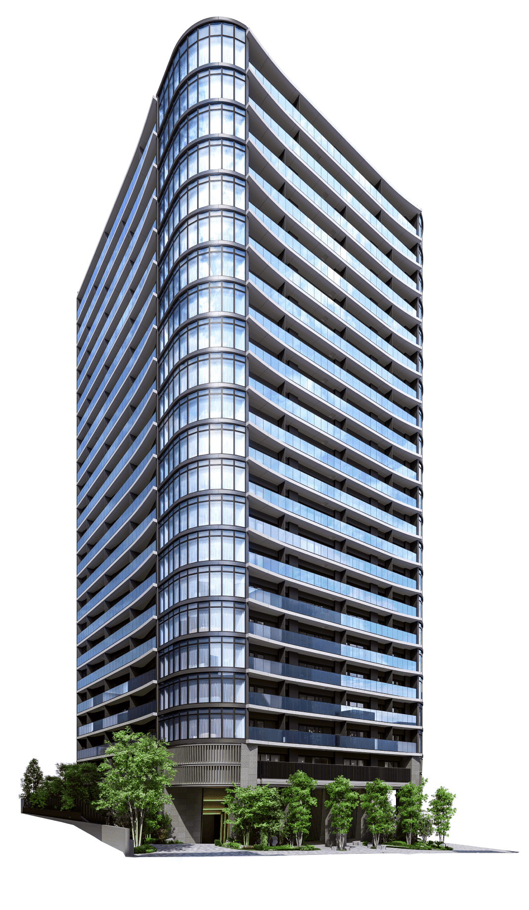 ※掲載の外観完成予想CG1は計画段階の図面を基に描き起こしたもので形状・色等は実際とは異なります。なお、外観形状の細部、設備機器等は表現しておりません。この完成予想図で表現されている植栽は竣工から初期の生育期間を経た状態のものを想定しており、竣工時には植物の生育を見込んで必要な間隔をとって植えています。