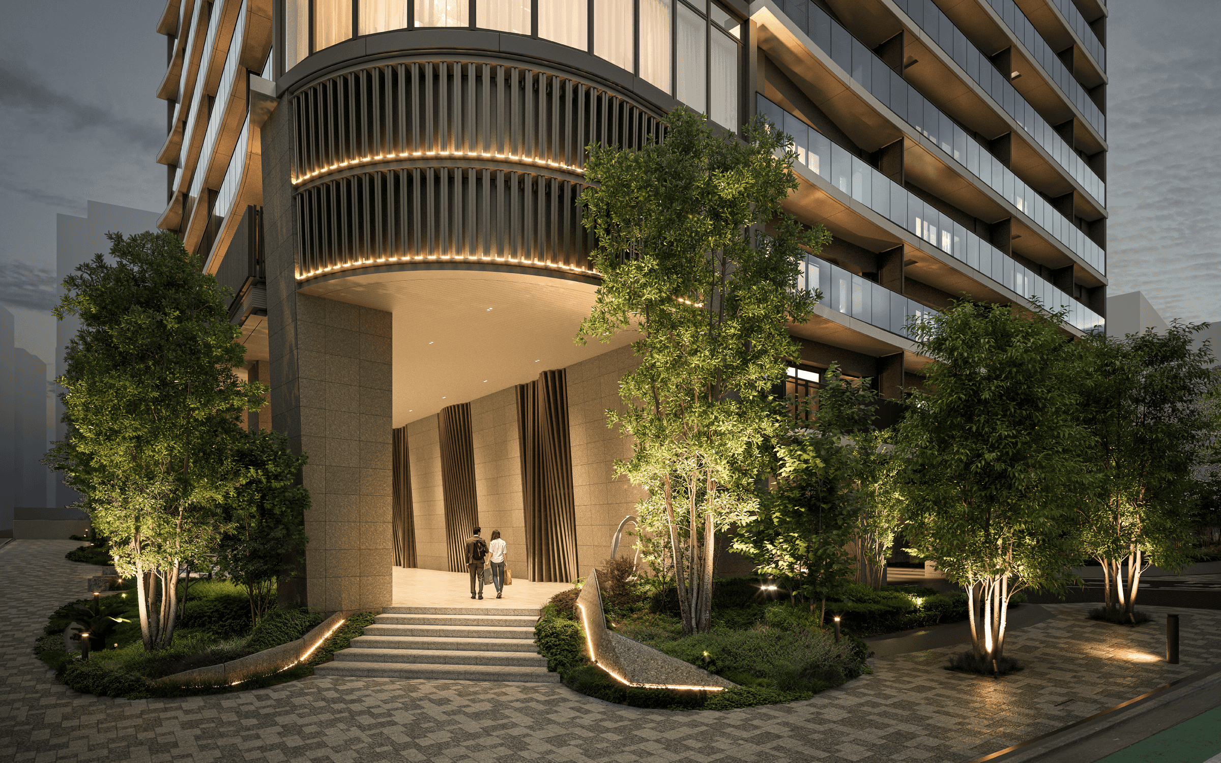 ※エントランス完成予想CGは計画段階の図面を基に描き起こしたもので、形状・色等は実際とは異なります。形状の細部、設備機器等は表現しておりません。表現されている植栽は初期の育成期間を経た状態のものを想定して描いており、竣工時は植物の育成を見込んで必要な間隔をとって植えております。また敷地内のみ表現しております。施工上の都合により設定位置・植高・本数等変更になる場合があります。