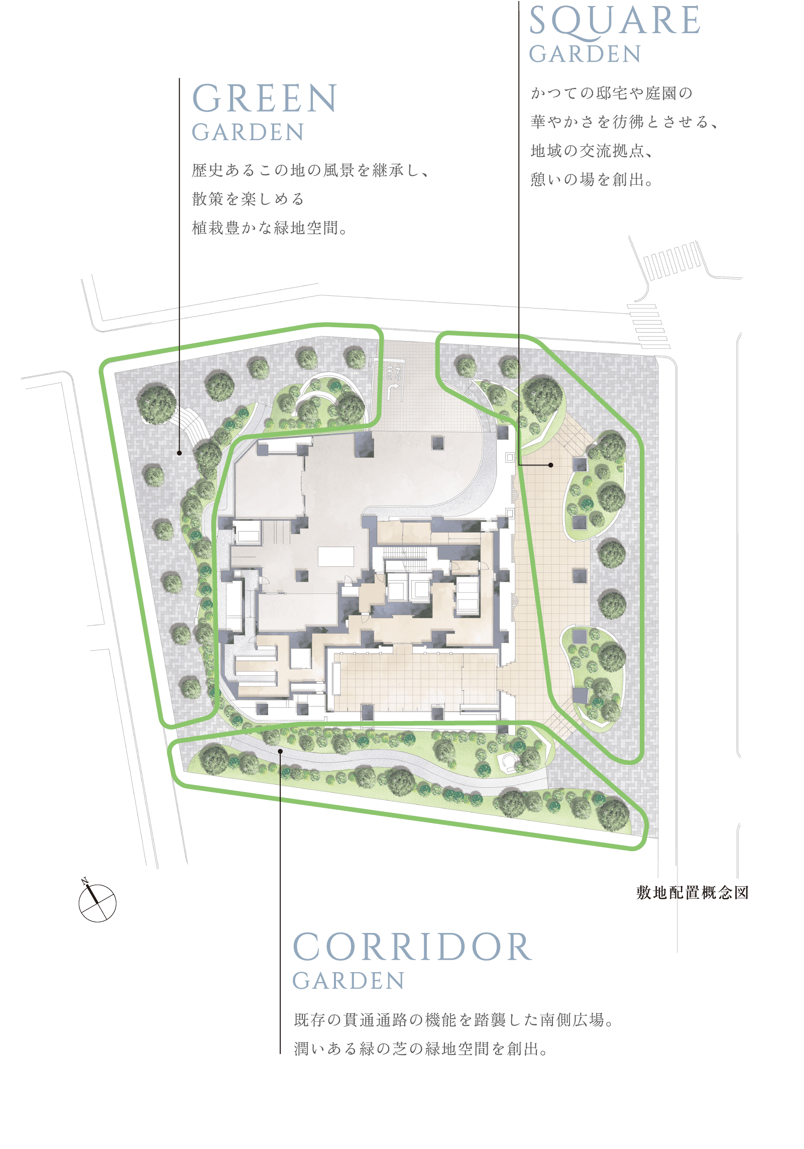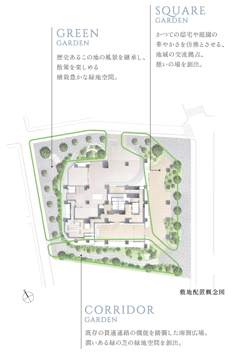 ※掲載の敷地配置概念図は、計画段階の図面を基に描き起こしたもので、形状・色等は実際とは異なります。なお、形状の細部、設備機器等は表現しておりません。表現されている植栽は初期の生育期間を経た状態のものを想定して描いており、竣工時は植物の生育を見込んで必要な間隔をとって植えております。施工上の都合により、設定位置・植高・本数等変更となる場合があります。周辺の道路・建物などについては一部簡略化しており、実際とは異なります。