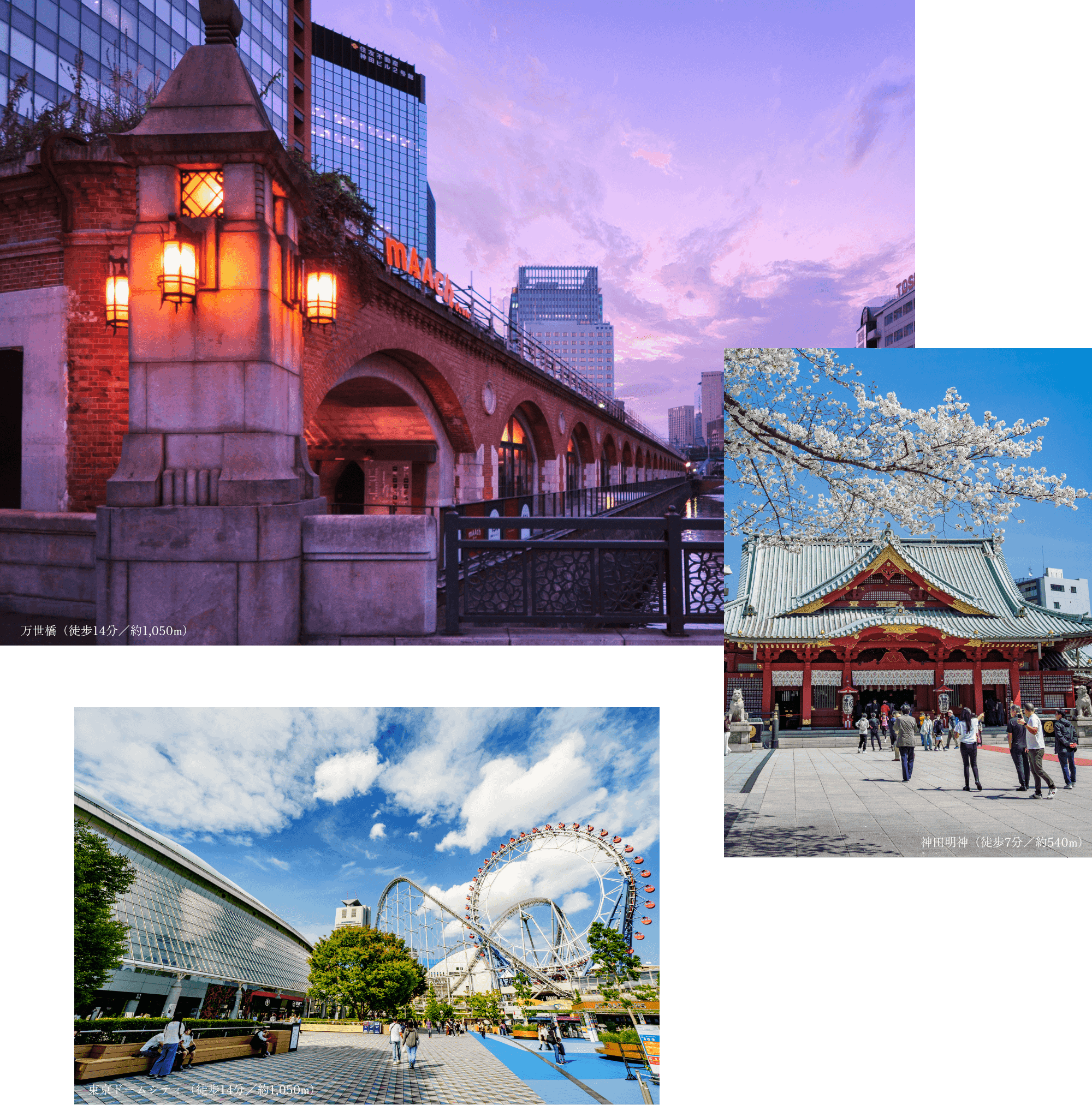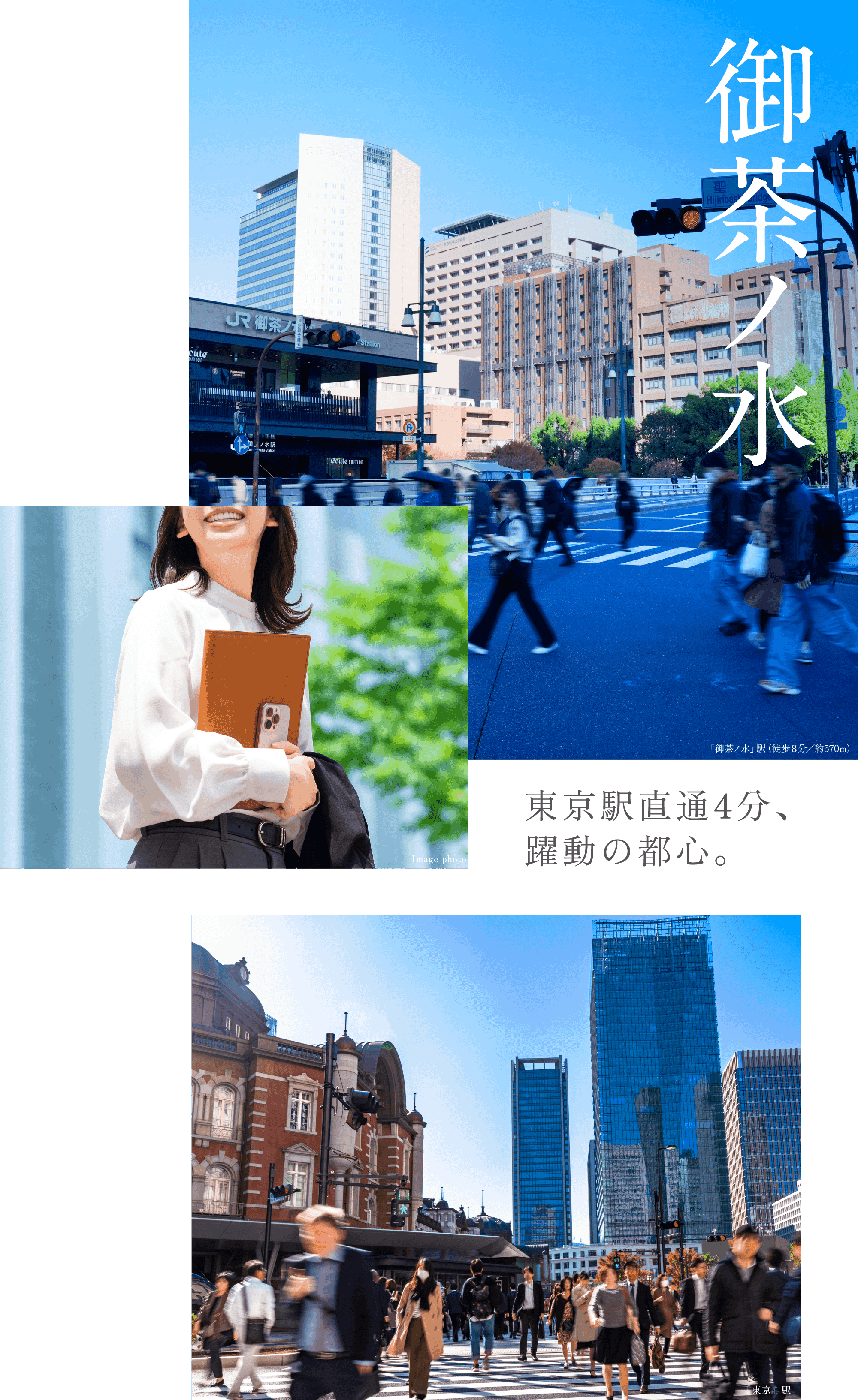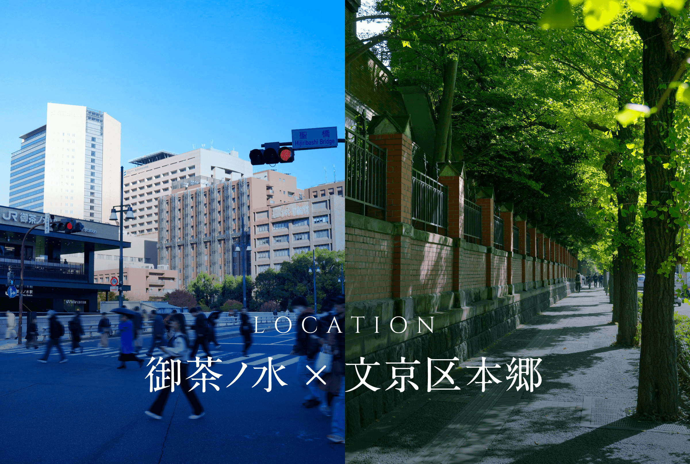 左:「御茶ノ水」駅(徒歩8分/約570m)右:現地周辺の街並(徒歩14分/約1,100m)