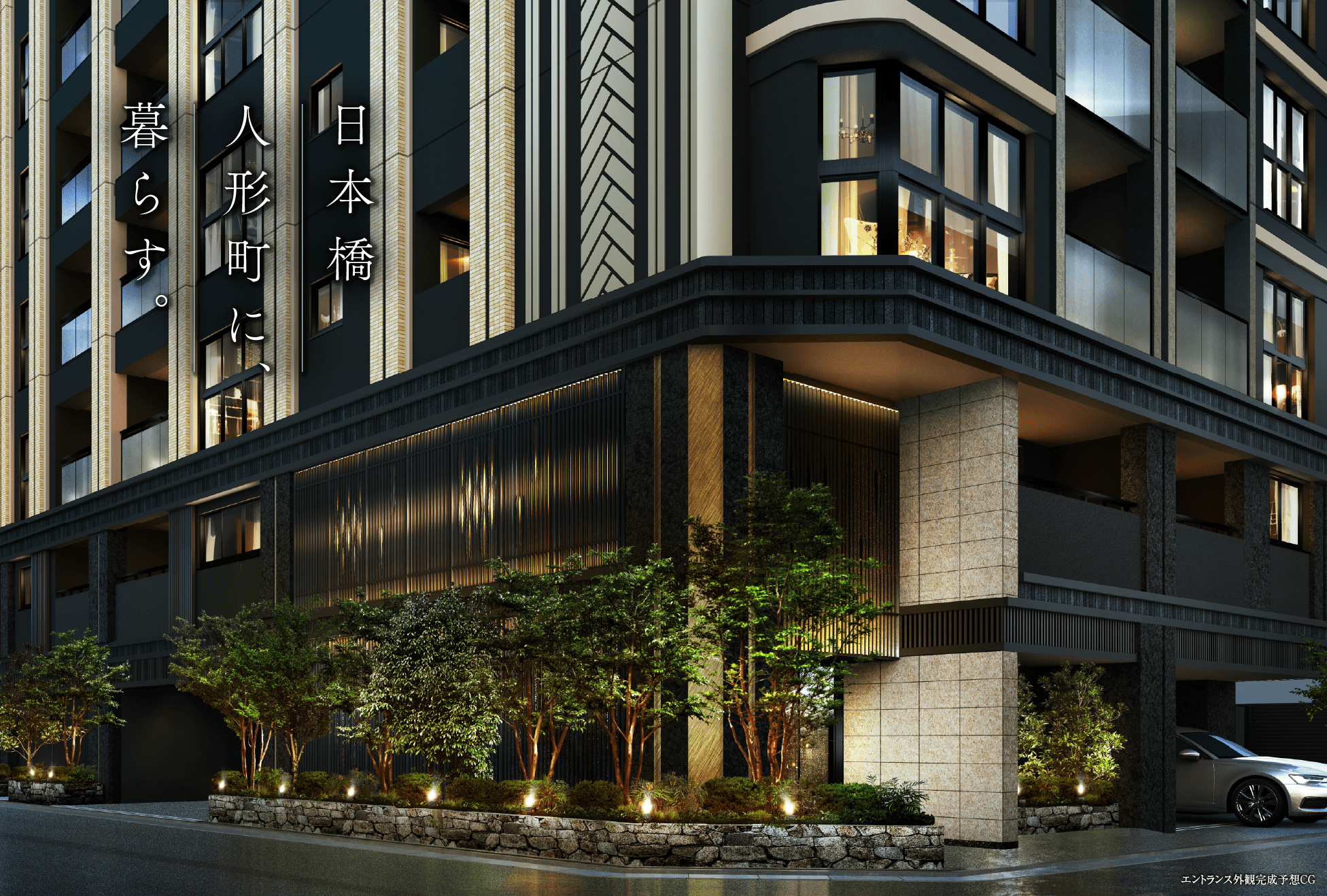 ※掲載の外観完成予想CG・エントランス外観完成予想CGは、計画段階の図面を基に描き起こしたもので、形状・色等は実際とは異なります。なお、形状の細部、設備機器等は表現しておりません。表現されている植栽は初期の生育期間を経た状態のものを想定して描いており、竣工時は植物の生育を見込んで必要な間隔をとって植えております。施工上の都合により、設定位置・植高・本数等変更となる場合があります。また、家具・調度品等は販売価格には含まれません。
