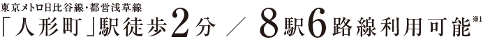 ※1.東京メトロ日比谷線・都営浅草線「人形町」駅徒歩2分(A5出口)、東京メトロ半蔵門線「水天宮前」駅徒歩6分(8出口)、東京メトロ日比谷線「小伝馬町」駅徒歩7分(3出口)、都営新宿線「浜町」駅徒歩9分(A1出口)、東京メトロ銀座線・東京メトロ半蔵門線「三越前」駅徒歩10分(B6出口)、JR総武本線「新日本橋」駅徒歩10分(5出口)、都営浅草線「東日本橋」駅徒歩10分(B2出口)、都営新宿線「馬喰横山」駅徒歩10分(A3出口)