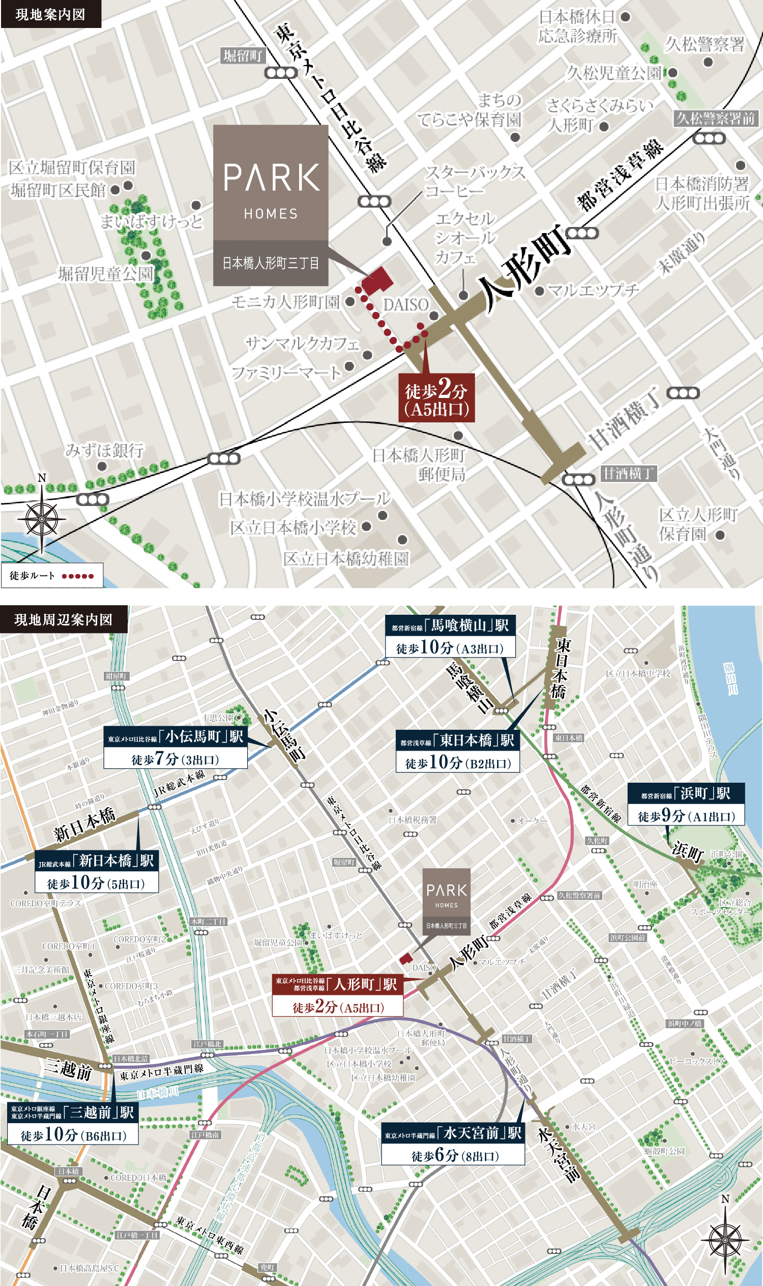 ※1.東京メトロ日比谷線・都営浅草線「人形町」駅徒歩2分(A5出口)、東京メトロ半蔵門線「水天宮前」駅徒歩6分(8出口)、東京メトロ日比谷線「小伝馬町」駅徒歩7分(3出口)、都営新宿線「浜町」駅徒歩9分(A1出口)、東京メトロ銀座線・東京メトロ半蔵門線「三越前」駅徒歩10分(B6出口)、JR総武本線「新日本橋」駅徒歩10分(5出口)、都営浅草線「東日本橋」駅徒歩10分(B2出口)、都営新宿線「馬喰横山」駅徒歩10分(A3出口)