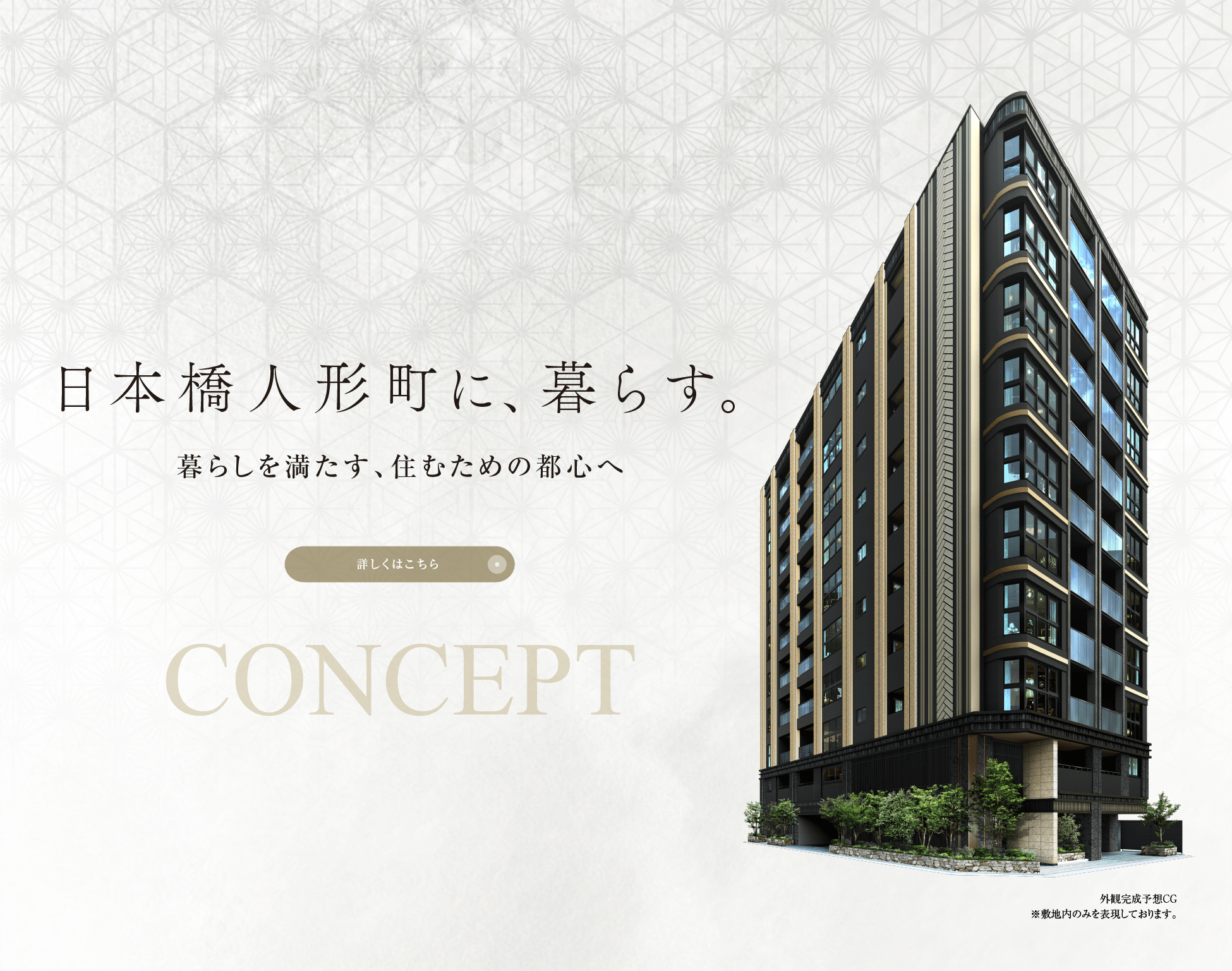※掲載の外観完成予想CG・エントランス外観完成予想CGは、計画段階の図面を基に描き起こしたもので、形状・色等は実際とは異なります。なお、形状の細部、設備機器等は表現しておりません。表現されている植栽は初期の生育期間を経た状態のものを想定して描いており、竣工時は植物の生育を見込んで必要な間隔をとって植えております。施工上の都合により、設定位置・植高・本数等変更となる場合があります。また、家具・調度品等は販売価格には含まれません。