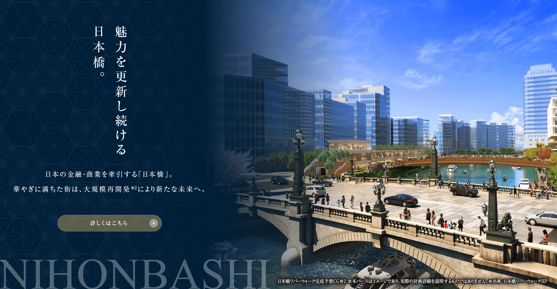 ※2.日本橋一丁目中地区第一種市街地再開発事業(現況:工事中)完成時期2026年3月末予定(徒歩9分/約680m)。八重洲一丁目北地区第一種市街地再開発事業(現況:工事中)完成時期南街区2030年度予定、北街区2035年度予定(徒歩13分/約990m)。日本橋室町一丁目地区第一種市街地再開発事業(現況:計画決定済)完成時期2031年予定(徒歩9分/約680m)。日本橋一丁目東地区第一種市街地再開発事業(現況:計画決定済)完成時期2038年予定(徒歩8分/約640m)。日本橋一丁目1・2番地区第一種市街地再開発事業(現況:計画決定済)完成時期2034年予定(徒歩12分/約890m)。※各事業の完成は遅れる場合があります。
