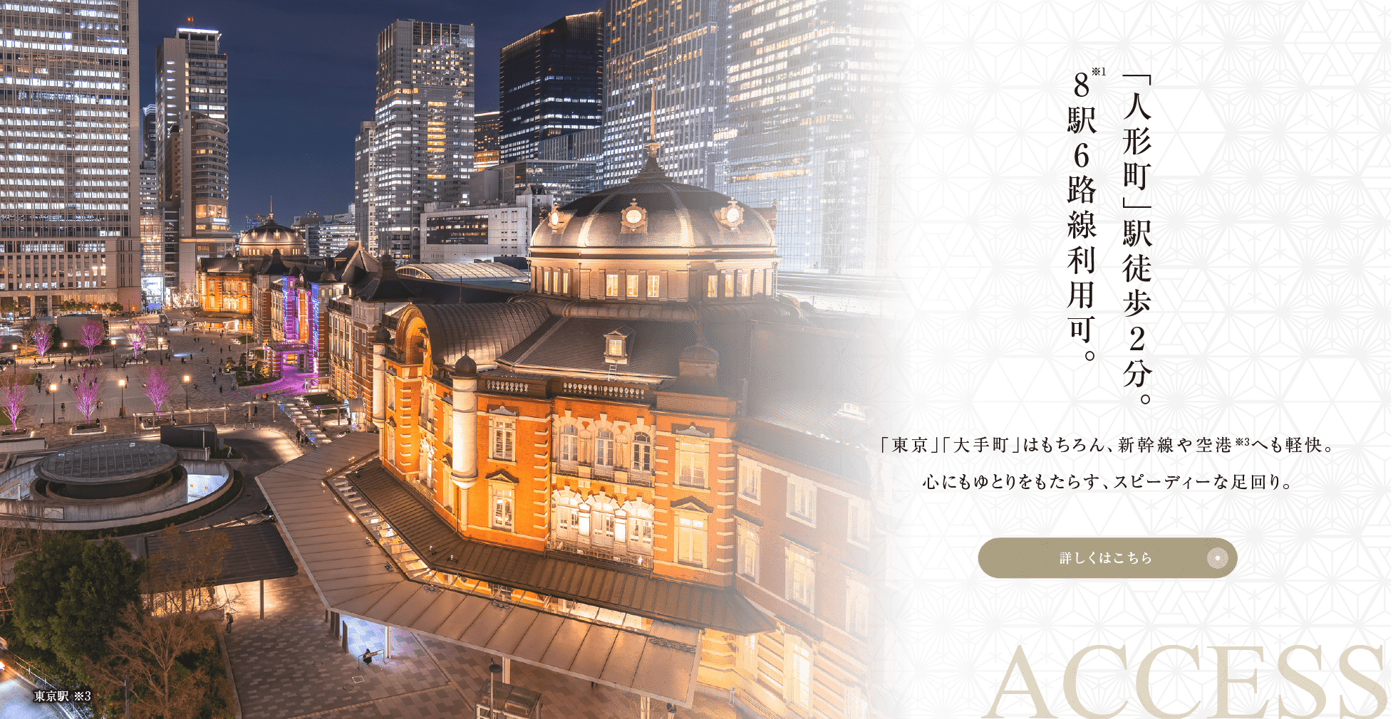 ※3.「東京」駅へ通勤時:11分、日中時:11分(東京メトロ日比谷線「人形町」駅より、「八丁堀」駅でJR京葉線に乗り換え。<日中時も通勤時と同経路>)/「大手町」駅へ通勤時:6分、日中時:9分(都営浅草線「人形町」駅より、「日本橋」駅で東京メトロ東西線に乗り換え。<日中時:東京メトロ日比谷線「人形町」駅より、「茅場町」駅で東京メトロ東西線に乗り換え。>)「東京」駅より東海道新幹線、上越新幹線、東北新幹線などが利用可能。「羽田空港第1・第2ターミナル」駅へ通勤時:40分、日中時:33分(「人形町」駅より都営浅草線快特(京急本線快特直通)<日中時も通勤時と同経路>)乗換・待ち時間を含みます。