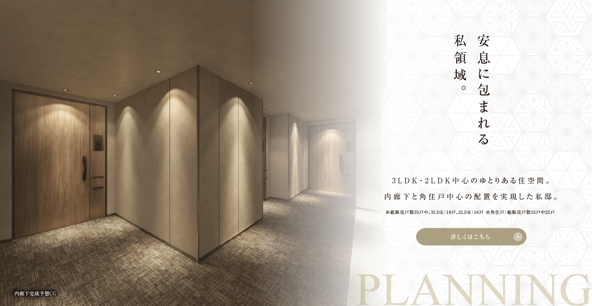 ※掲載の内廊下・エントランスホール完成予想CGは計画段階の図面を基に描き起こしたもので、形状・色等は実際とは異なります。共用部のアート·調度品等は変更となる可能性があります。