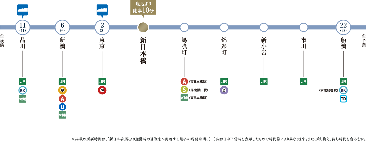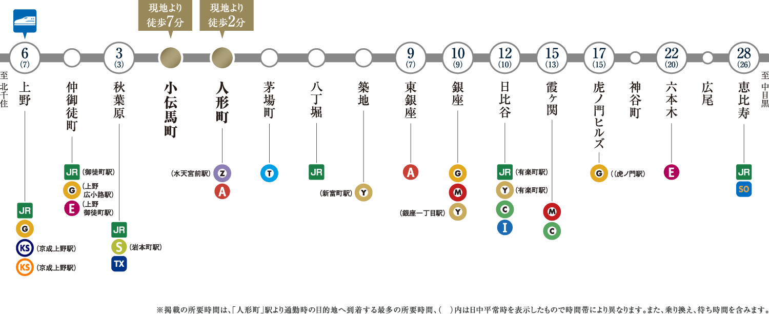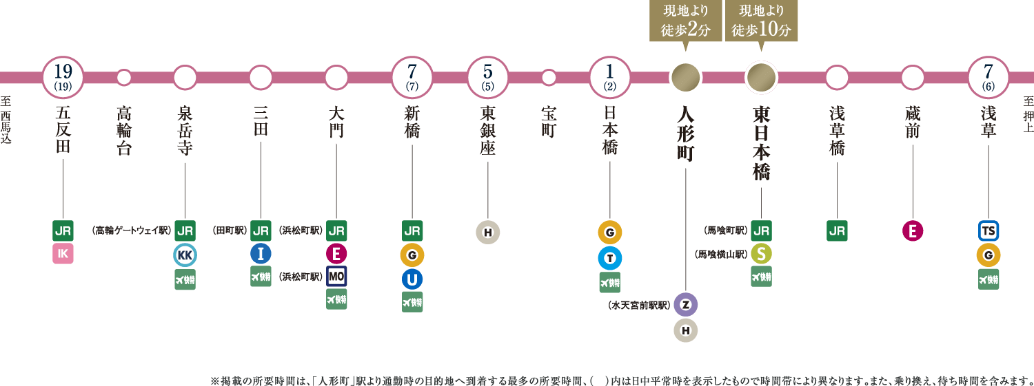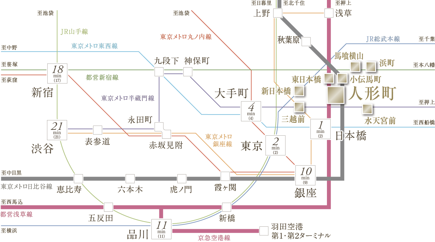 ※表示の所要時間は、「日本橋」駅:「人形町」駅より都営浅草線直通、「東京」駅:「新日本橋」駅からJR総武本線直通、「大手町」駅:「水天宮前」駅より東京メトロ半蔵門線直通、「銀座」駅:「人形町」駅より東京メトロ日比谷線直通、「品川」駅:「新日本橋」駅からJR総武本線直通、「新宿」駅:「浜町」駅より都営新宿線直通、「渋谷」駅:「水天宮前」駅より東京メトロ半蔵門線直通を利用した場合のもので、通勤時(7:30~9:00)、()内は平日・日中時(11:00~16:00)の目的駅へ到着する最も本数の多い電車のものです。所要時間に乗り換え待ち時間を含んでいます。また、時間帯により多少異なります。