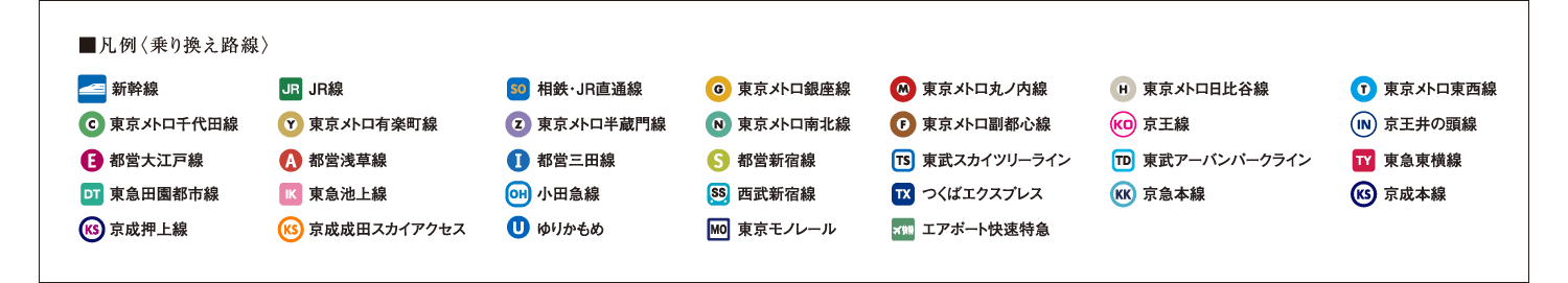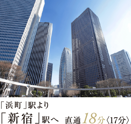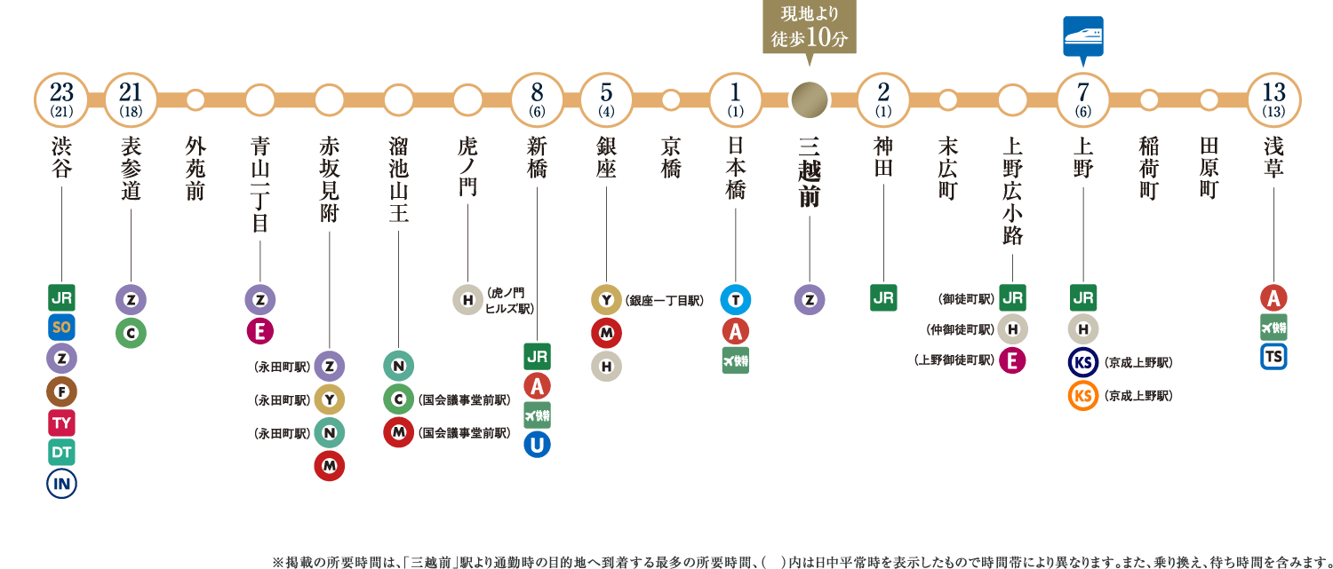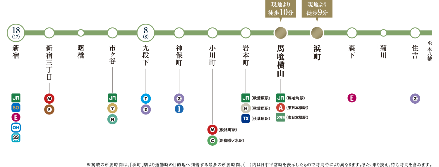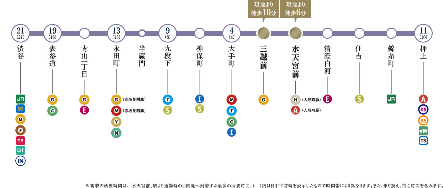 ※表示の所要時間は、「日本橋」駅:「人形町」駅より都営浅草線直通、「東京」駅:「新日本橋」駅からJR総武本線直通、「大手町」駅:「水天宮前」駅より東京メトロ半蔵門線直通、「銀座」駅:「人形町」駅より東京メトロ日比谷線直通、「品川」駅:「新日本橋」駅からJR総武本線直通、「新宿」駅:「浜町」駅より都営新宿線直通、「渋谷」駅:「水天宮前」駅より東京メトロ半蔵門線直通を利用した場合のもので、通勤時(7:30~9:00)、()内は平日・日中時(11:00~16:00)の目的駅へ到着する最も本数の多い電車のものです。所要時間に乗り換え待ち時間を含んでいます。また、時間帯により多少異なります。
