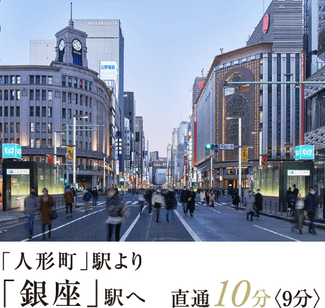 東京メトロ日比谷線「⼈形町」駅より直通。〈日中時も通勤時と同経路〉