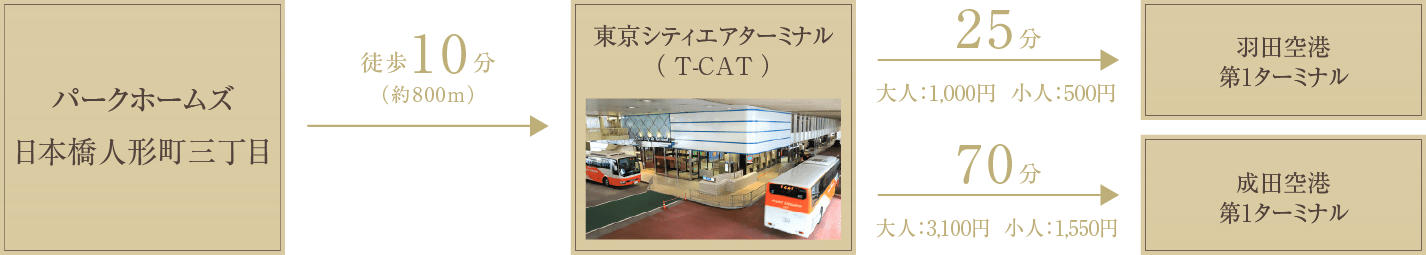 現地から徒歩10分の「東京シティ・エア・ターミナル(T-CAT)」からは「羽田空港」「成田空港」行きリムジンバスが運行。「羽田空港」方面へは30便、「成田空港」方面へは19便が毎日運行しています。