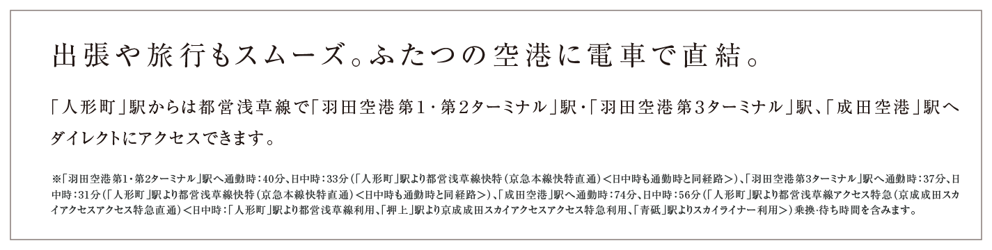 都営浅草線「⼈形町」駅より、京急本線特急直通。〈日中時も通勤時と同経路〉