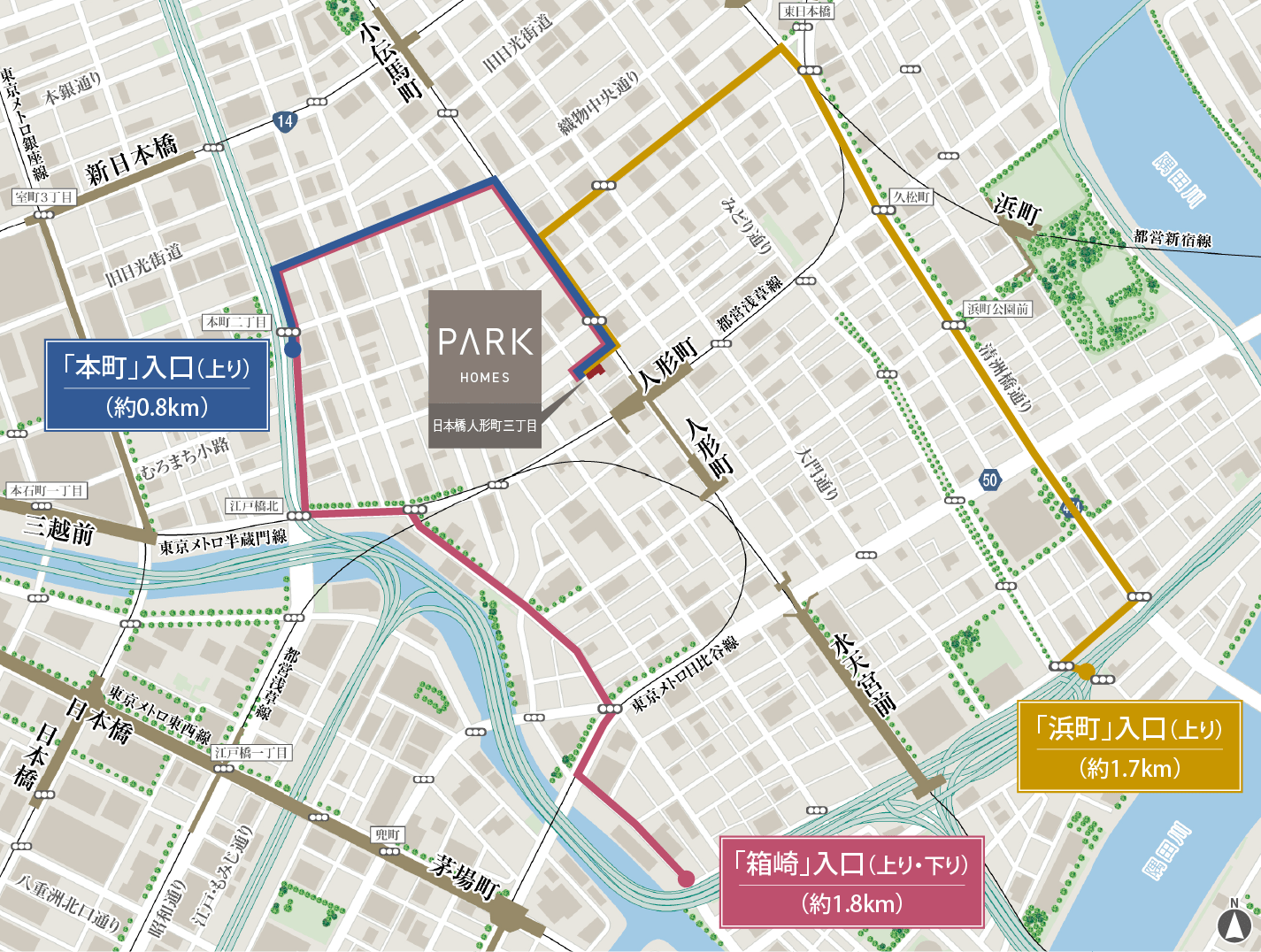 都営新宿線「浜町」駅より直通。〈日中時も通勤時と同経路〉
