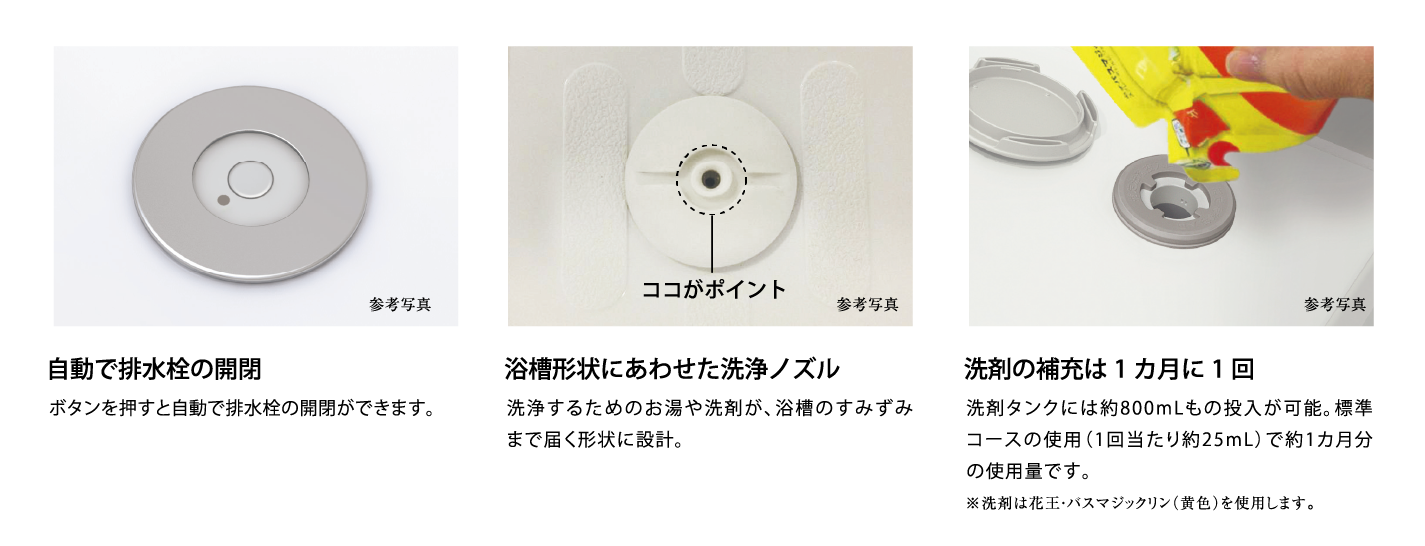 ボタンひとつで浴槽を自動洗浄。予備洗浄・洗剤吹き付け・すすぎの工程により浴槽をすみずみまで洗い、毎日の心地よい良い入浴をサポートします。