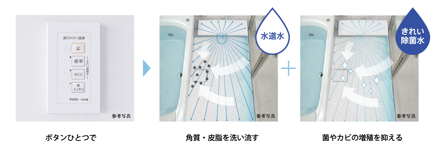 ボタンひとつでバスルームの床を洗浄・除菌可能。皮脂や角質汚れを洗い流し、「きれい除菌水」で除菌仕上げ。