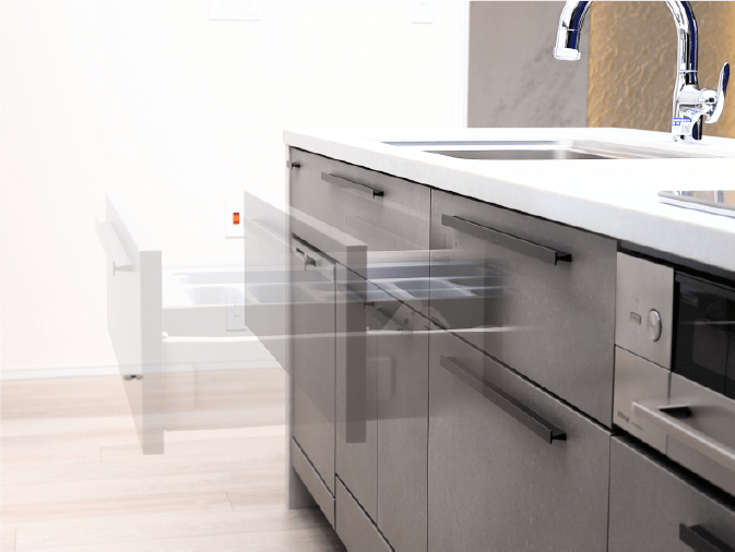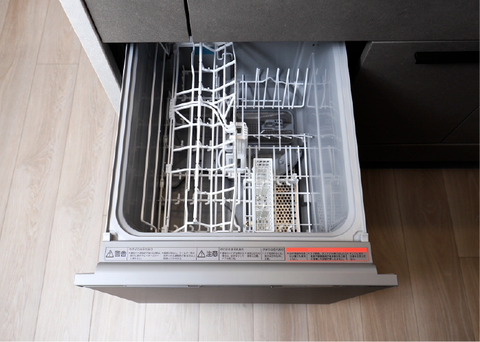 ビルトインタイプの食器洗浄乾燥機。水圧により洗浄できるので、手洗いの場合よりも節水できます。