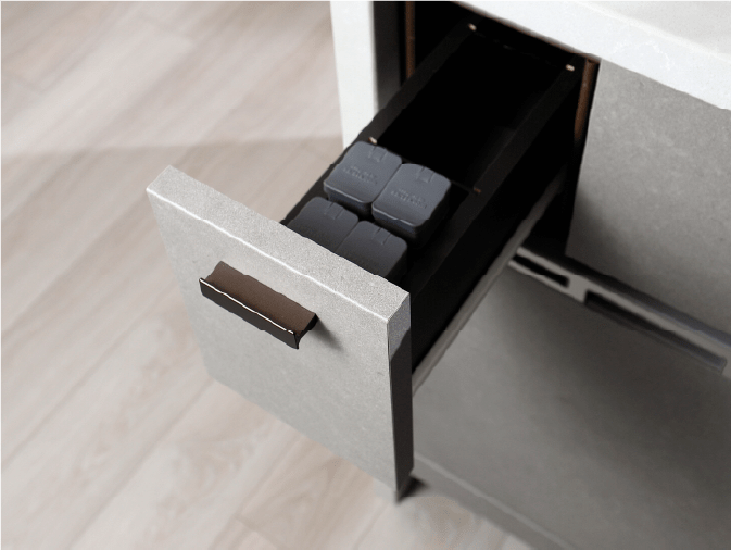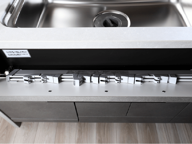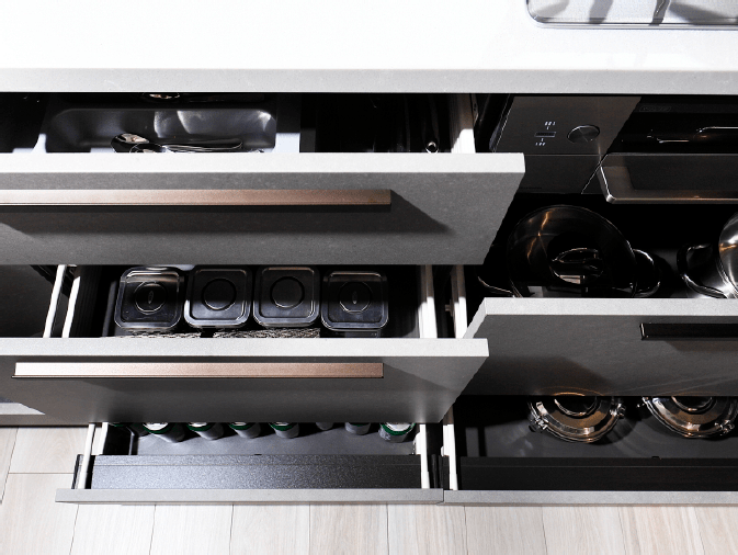 お料理の時でも物が取り出しやすいスライド式収納を採用。開閉もスムーズで便利です。