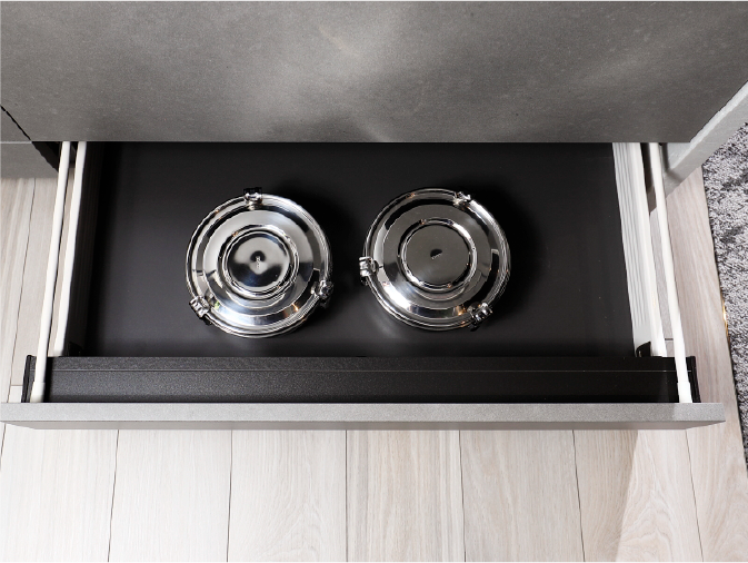 鍋や食器、食材等を効率的に整理できるスライド収納を採用しています。