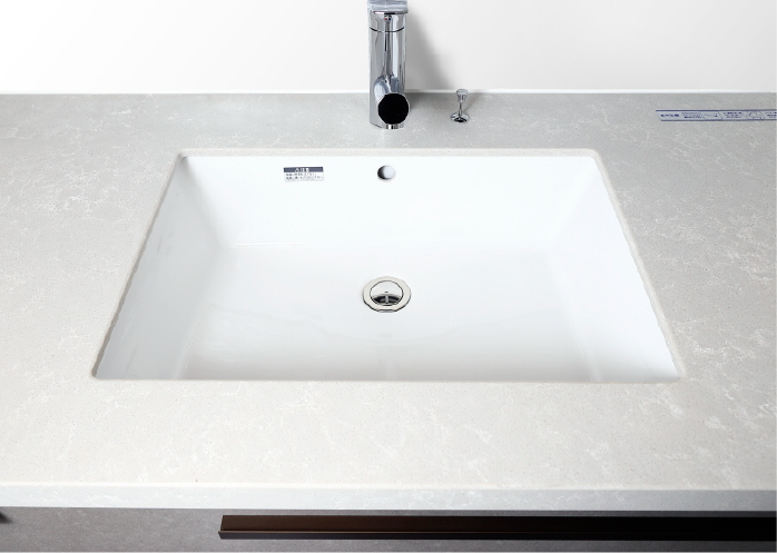 天然の水晶を使用しているため高級感があり、傷や汚れに強く、お手入れがしやすいフィオレストーン天板に、上質な印象の陶器ボウルを設置しています。