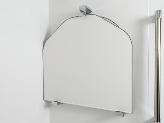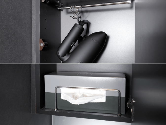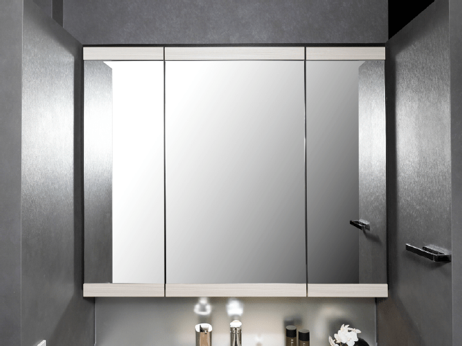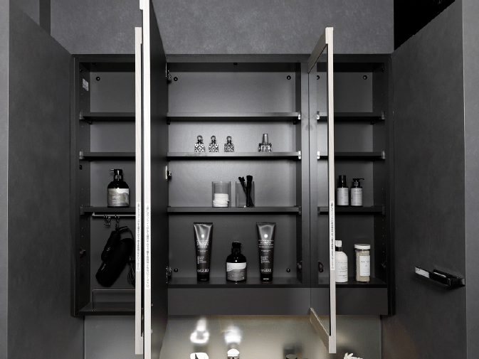 三面鏡としての機能と、収納としての機能を兼ね備えたミラーキャビネットです。倒れやすいドライヤーなどを引っ掛けてスッキリ収納できるドライヤーフックや、ティッシュBOXスペースなどを設けました。三面鏡は、防湿鏡となっており、また収納棚の下には、クリアミラーを設置しています。
