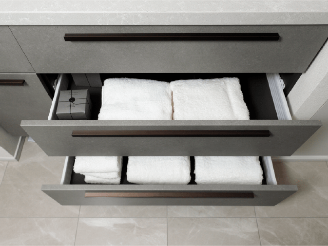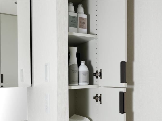洗面室には、タオルや洗剤などのランドリー用品が収納できるリネン庫を設置しています。