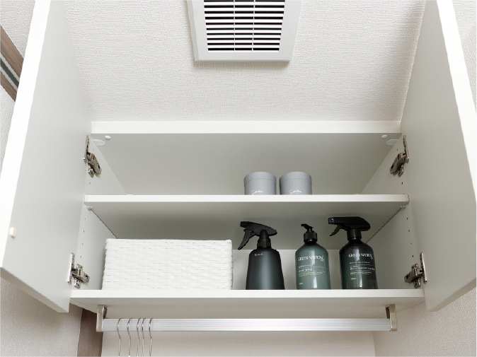 洗面化粧台の下部に豊富な収納スペースをご用意。お掃除のアイテムなどすっきりと収納できます。