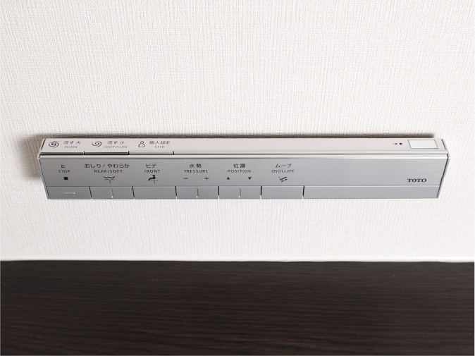 スタイリッシュな形状のスティックリモコン。水勢の強弱・洗浄位置・温水の温度をお好みの設定でリモコンに登録できます。最大4名まで登録可能。