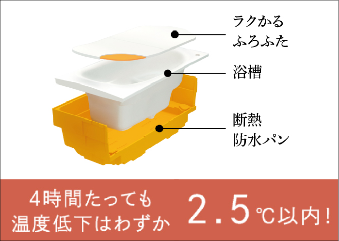 浴槽を断熱材で包み込んだ魔法びんのような構造で、お湯の温かさを保ちます。4時間経過しても温度低下はわずか2.5℃以内に抑えられます。