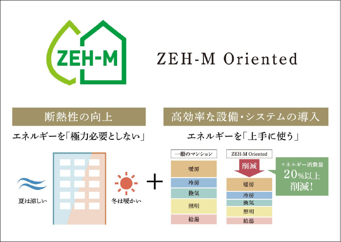 ZEH-M Orientedとは、断熱性能等を向上させるとともに、高効率な設備システムの導入により大幅な省エネを実現し、共用部を含むマンション全体での一次エネルギー消費量を20%以上削減※1したマンションです。