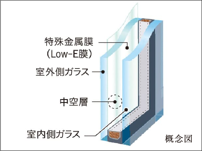 複層ガラスの室外側のガラスに特殊金属膜「Low-E膜」をコーティング。冷暖房効率を高め、快適な室内空間を演出します。