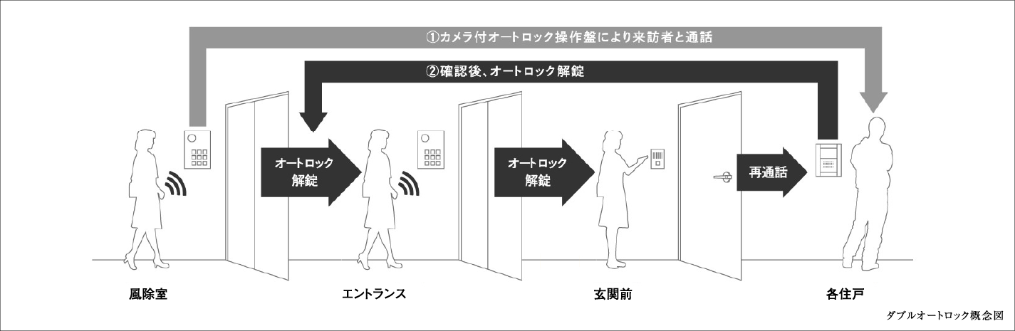 エントランスには、居住者や来訪者と共に入館する侵入手口を抑止する、ダブルオートロック方式のカメラ付オートロック操作盤を設置しています。